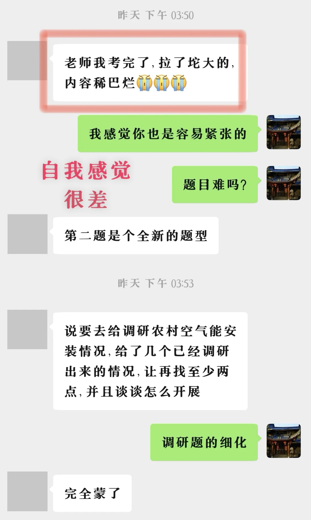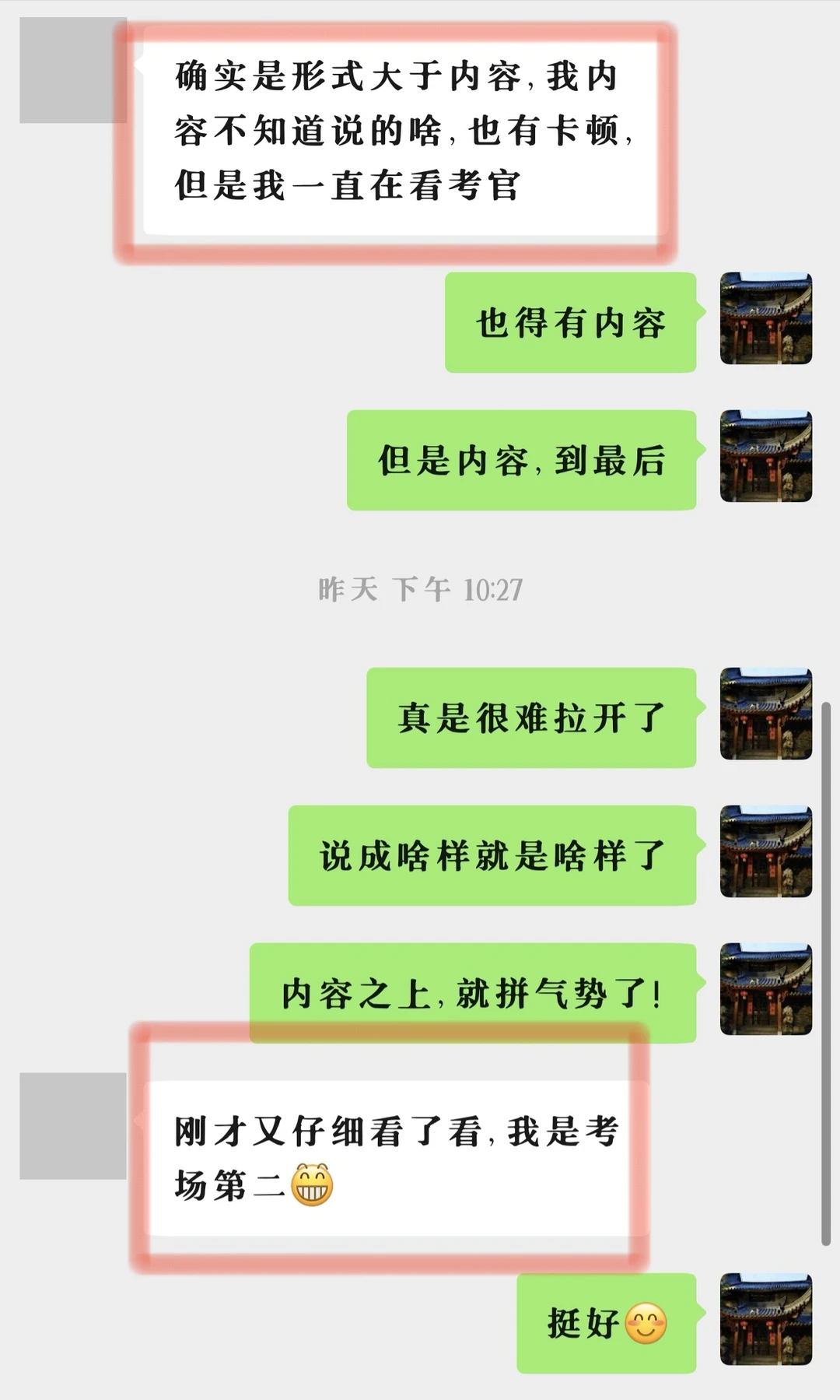 考前几天我就一直跟她强调,这时候背也背不进去了,咱们调调思路和结构,主要练状态,要盯着考官,要笑,要自信!最后几天了内容上能实现的突破已经很有限了,两个半月都学不会的东西两三天能学会?这时候就要拼气势了,虽然是个腼腆的女孩子,也努力做到了。