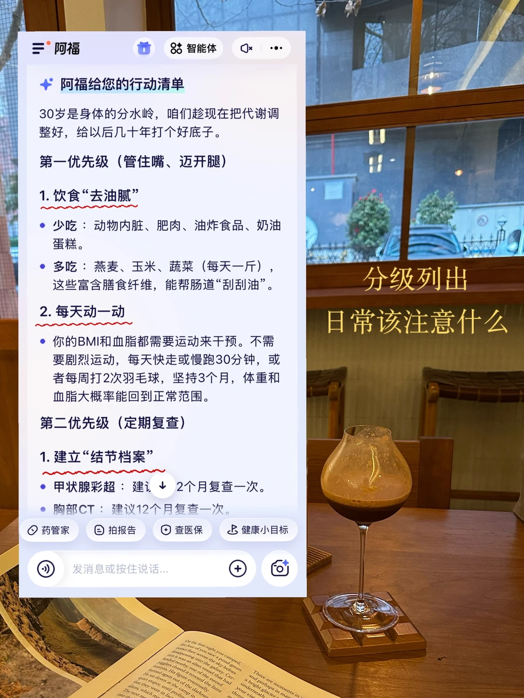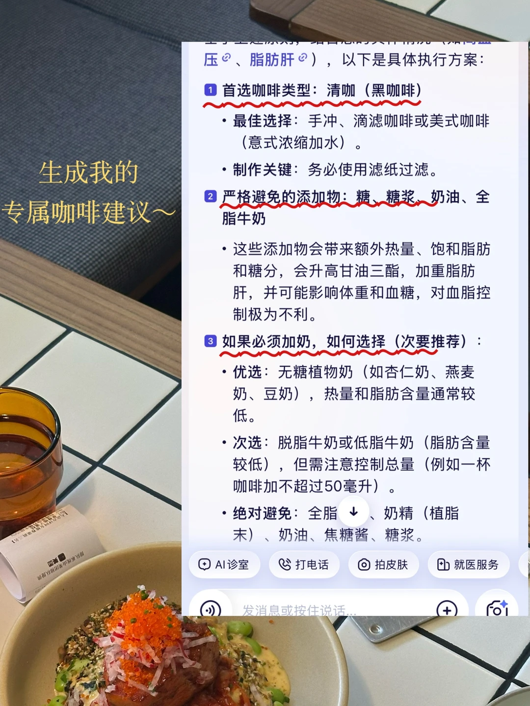 对于能不能喝咖啡的问题,阿福没给我那种网上十个有九个雷同的低脂饮食万能建议,而是看着我的数值直接列了咖啡推荐: