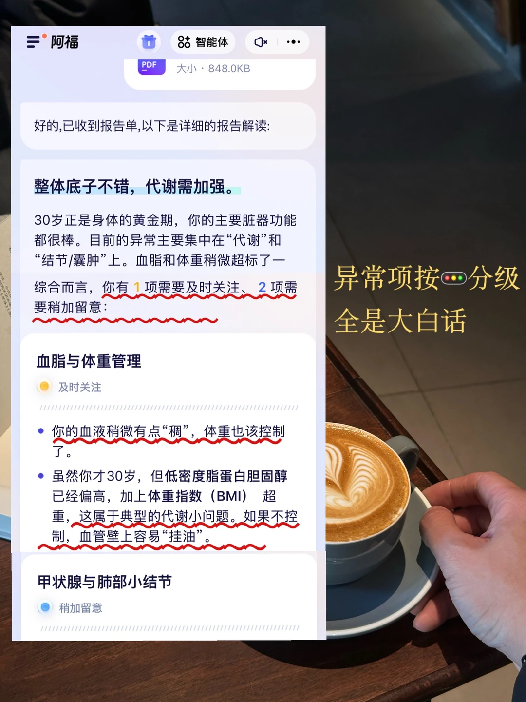 我看血脂异常就被划分成了黄灯,需要及时关注。阿福用大白话给我解释,我的血液有点“稠”,属于典型的代谢小问题,不控制的话,血管容易“挂油”。