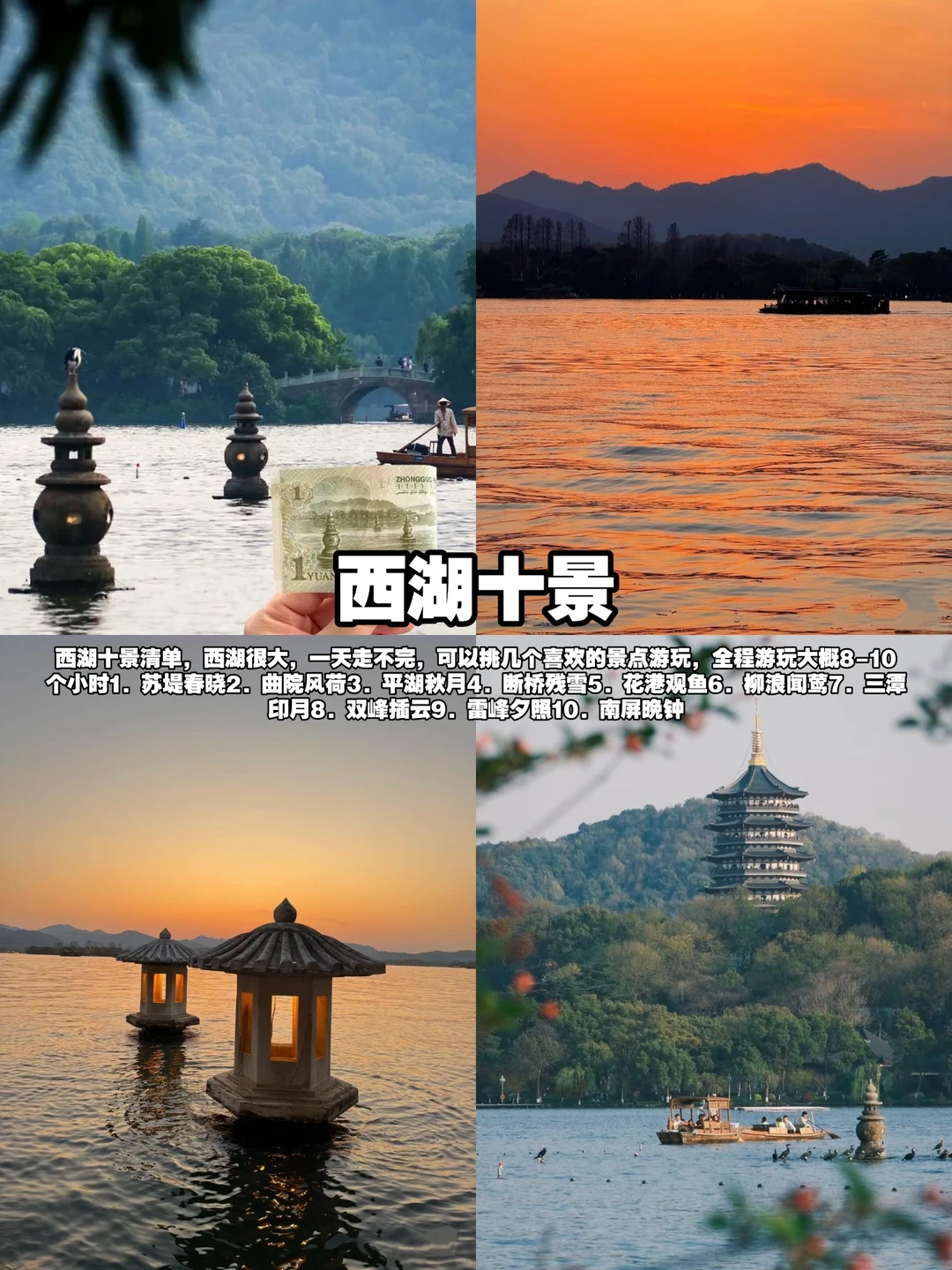 西湖真的很大!一天根本走不完,西湖十景清单,挑喜欢的玩就行: