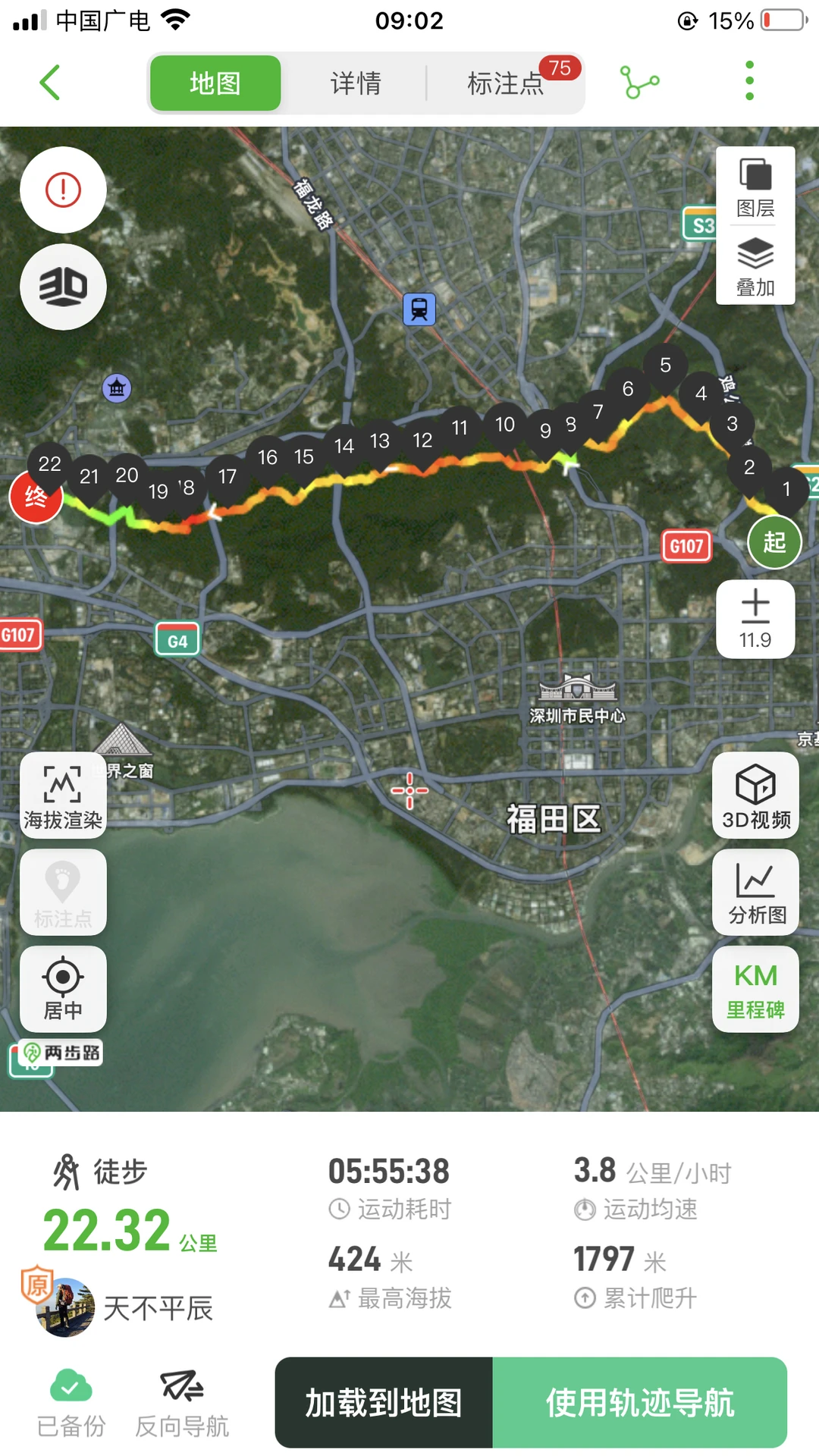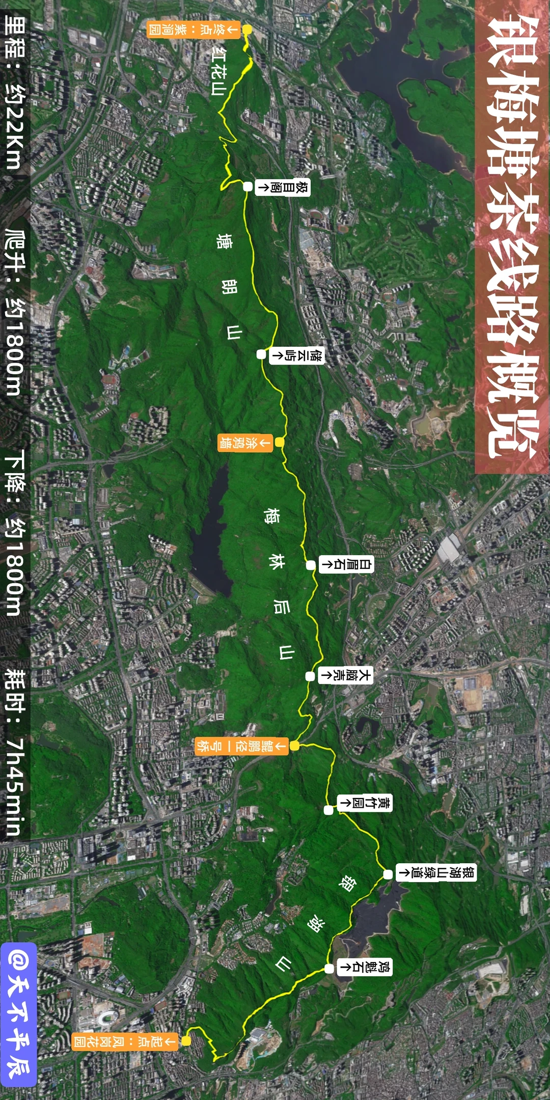 路线全程约22公里,爬升约1800米,下降约1800米,穿越深圳市中心,融合城市景观和自然野区,有着城市天际线的美誉,同时因路线有着较大的强度和难度,被户外爱好者称为“小三水线”,是诸多户外爱好者进阶三水线的试炼场和户外大神日常训练的拉练场。