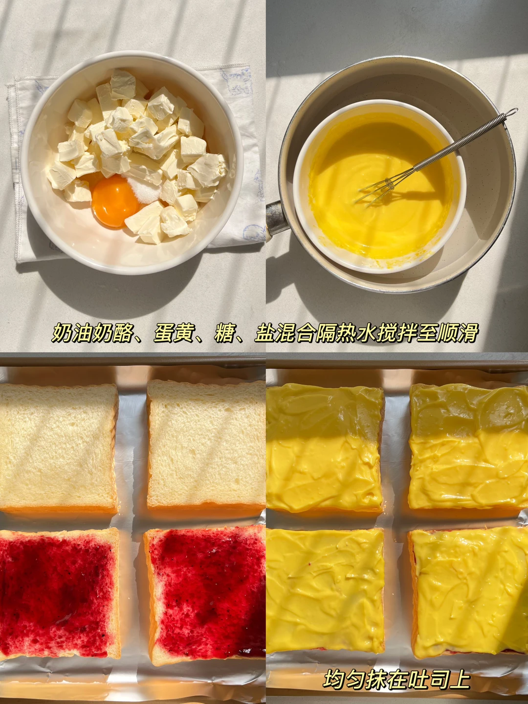 的三餐四季 [种草R]每次做这个,出炉就被秒光😋 [鼓掌R]太有成就感了[耶R] [向右R]画重点❗️一点要用厚切吐司哦🍞 💛准备材料: 🍞吐司4片 🧀️岩烧乳酪酱: 奶油奶酪150克|细砂糖15克|蛋黄2个|盐1克 ✅做法: 1⃣️乳酪酱所有材料混合隔热水不停搅拌至融化。 2⃣️搅拌均匀后涂抹在吐司片表面。 3⃣️放入提前预热好的烤箱,中层,上下火模式(烘焙),上火200度下火150度烤10分钟(表面上色出炉)。 这个岩烧乳酪吐司真的太好吃了[种草R]求你们都去做❗️