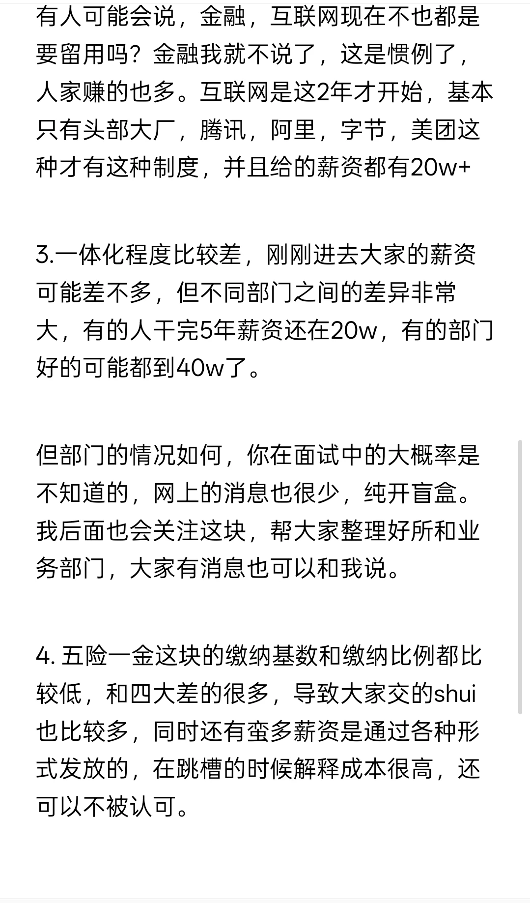 4. 五险一金这块的缴纳基数和缴纳比例都比较低,和四大差的很多,导致大家交的shui也比较多,同时还有蛮多薪资是通过各种形式发放的,在跳槽的时候解释成本很高,还可以不被认可。