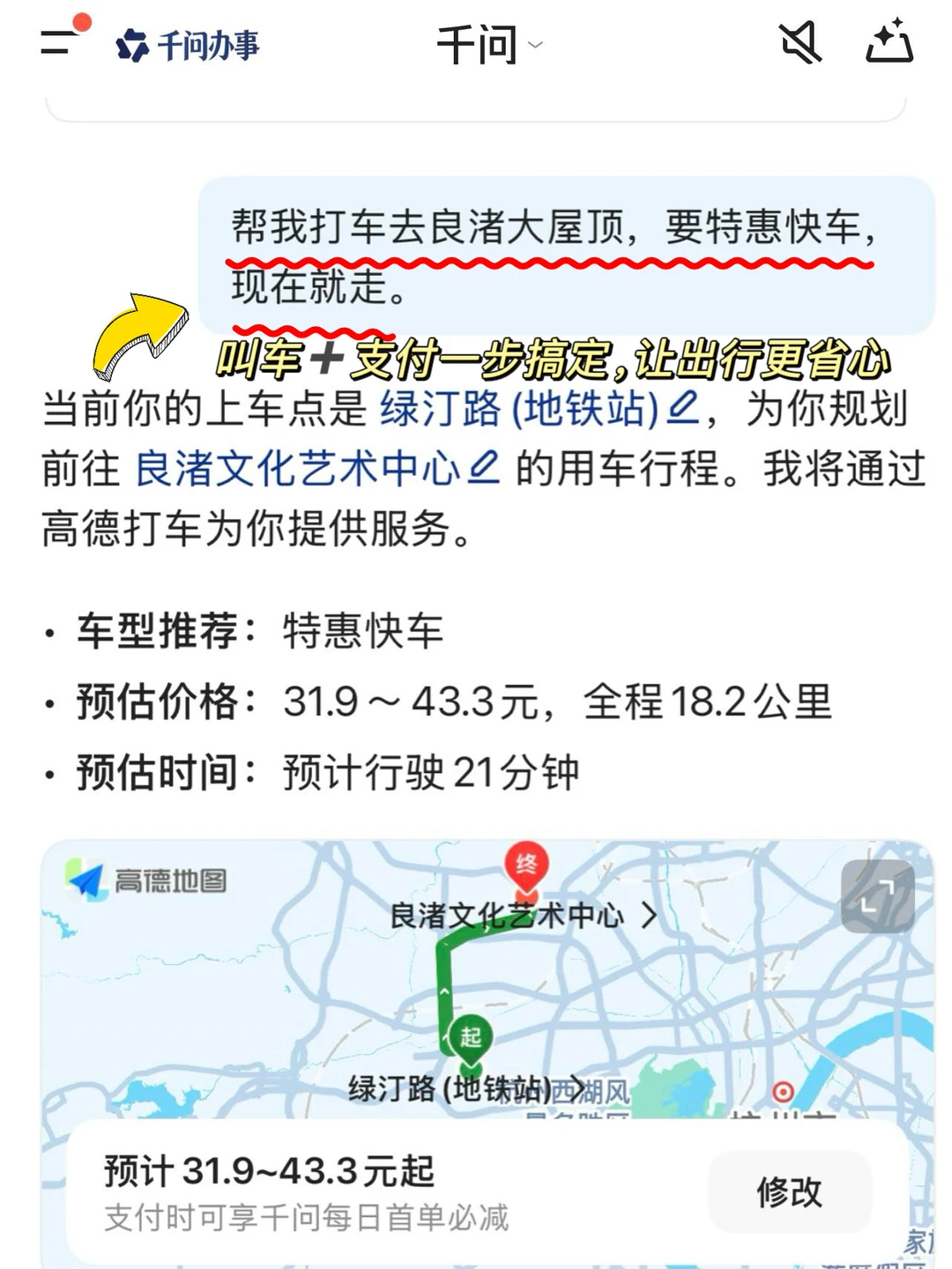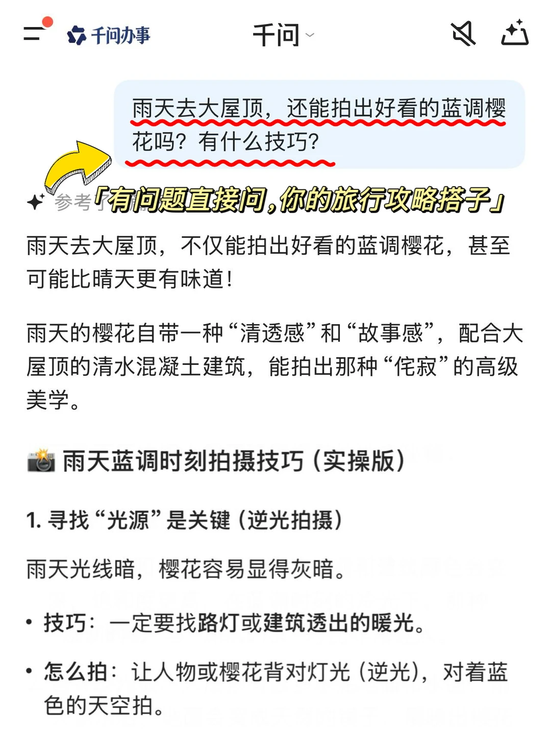 🚗交通:在千问直接输入「帮我规划去大屋顶赏樱的行程」,AI会帮你制定好完整行程路线,之后直接一键打车,只要跟千问说“千问,帮我打车去大屋顶樱花大道,想要空气清新的车”,千问立马帮你安排空气清新的车辆省心又划算~