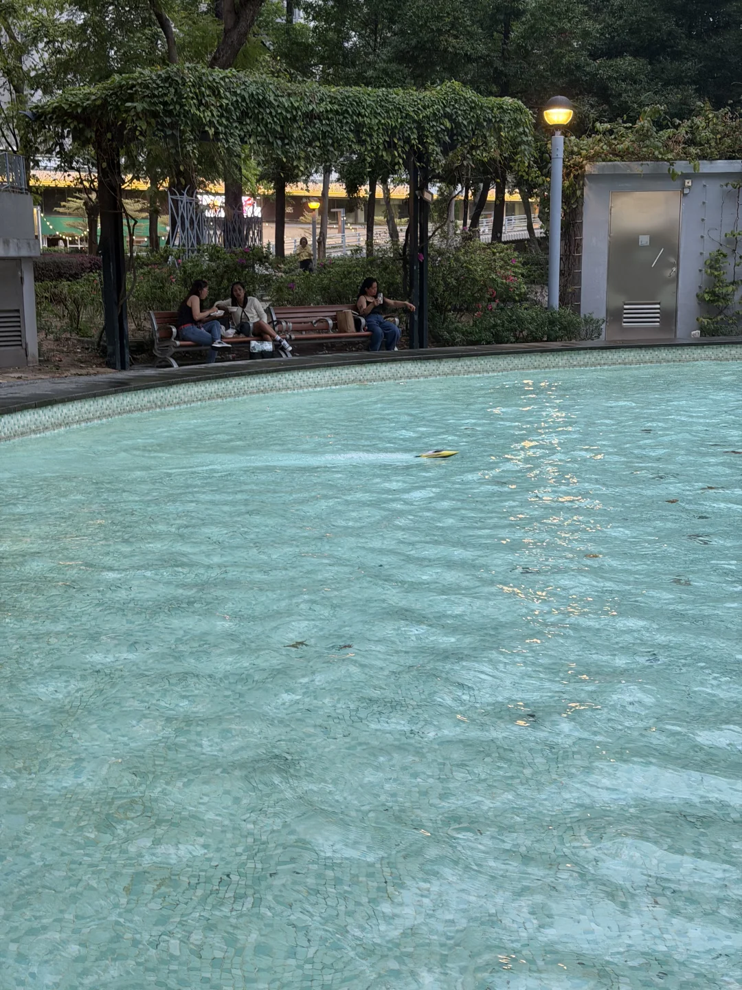 傍晚时分很多人在水池边坐着,边看模型船边休息聊天💬十分惬意