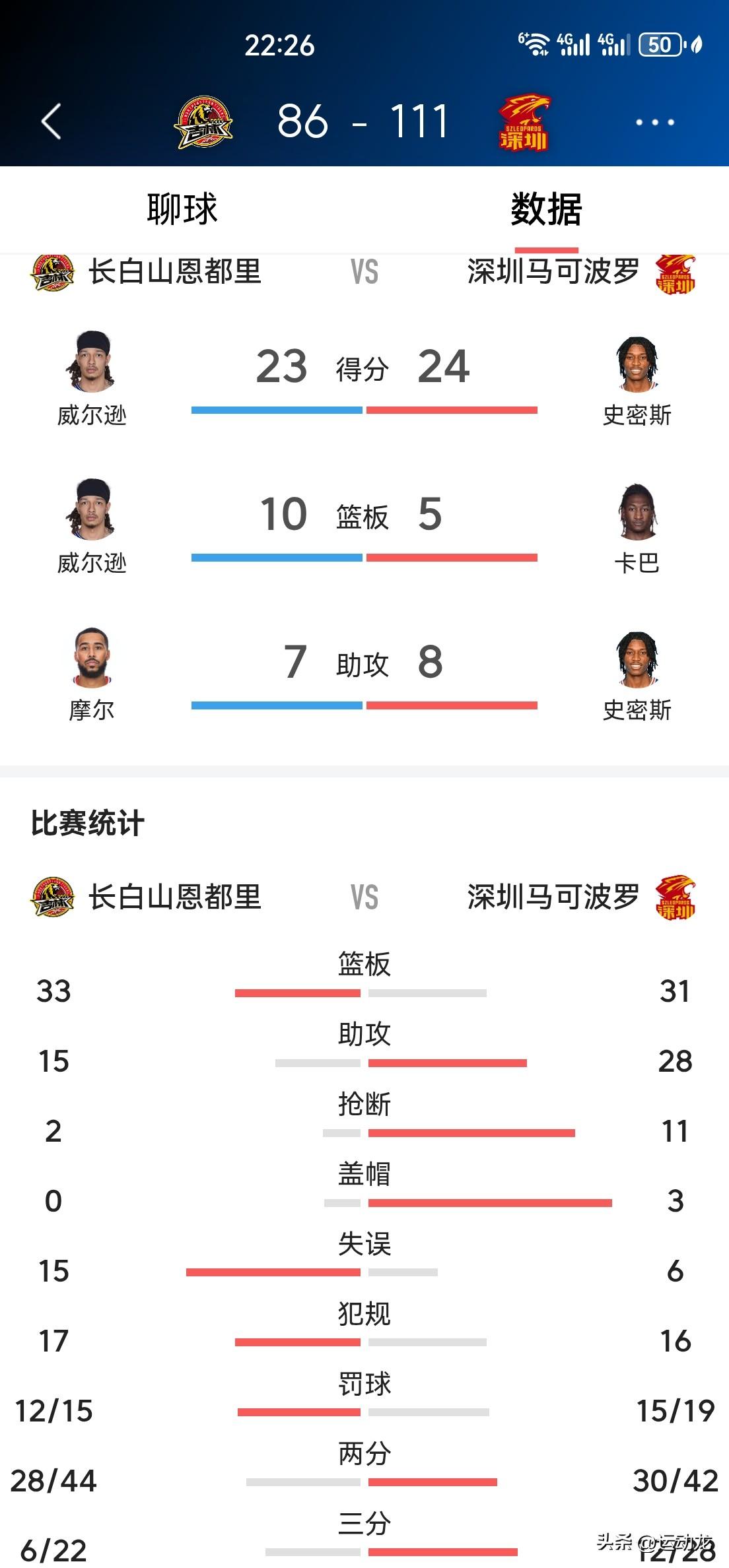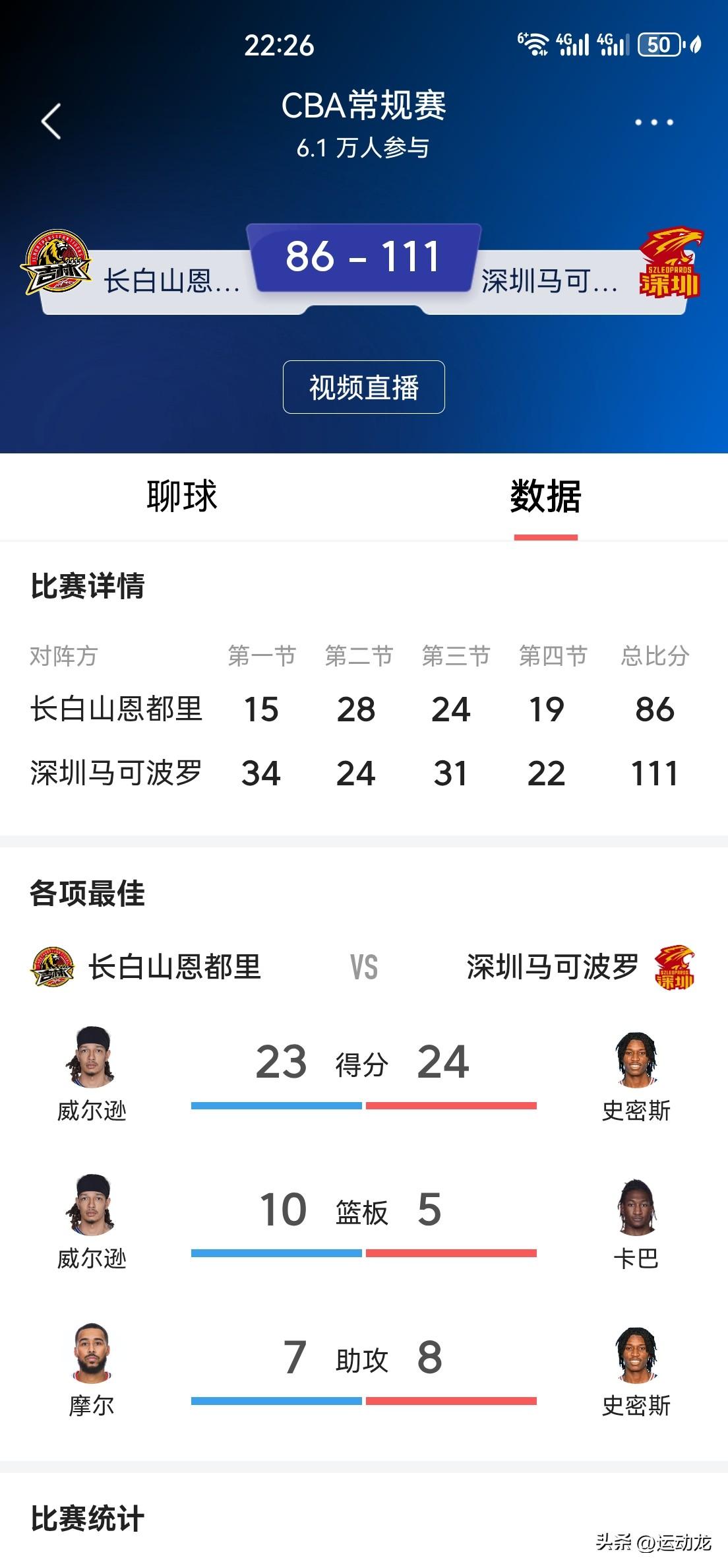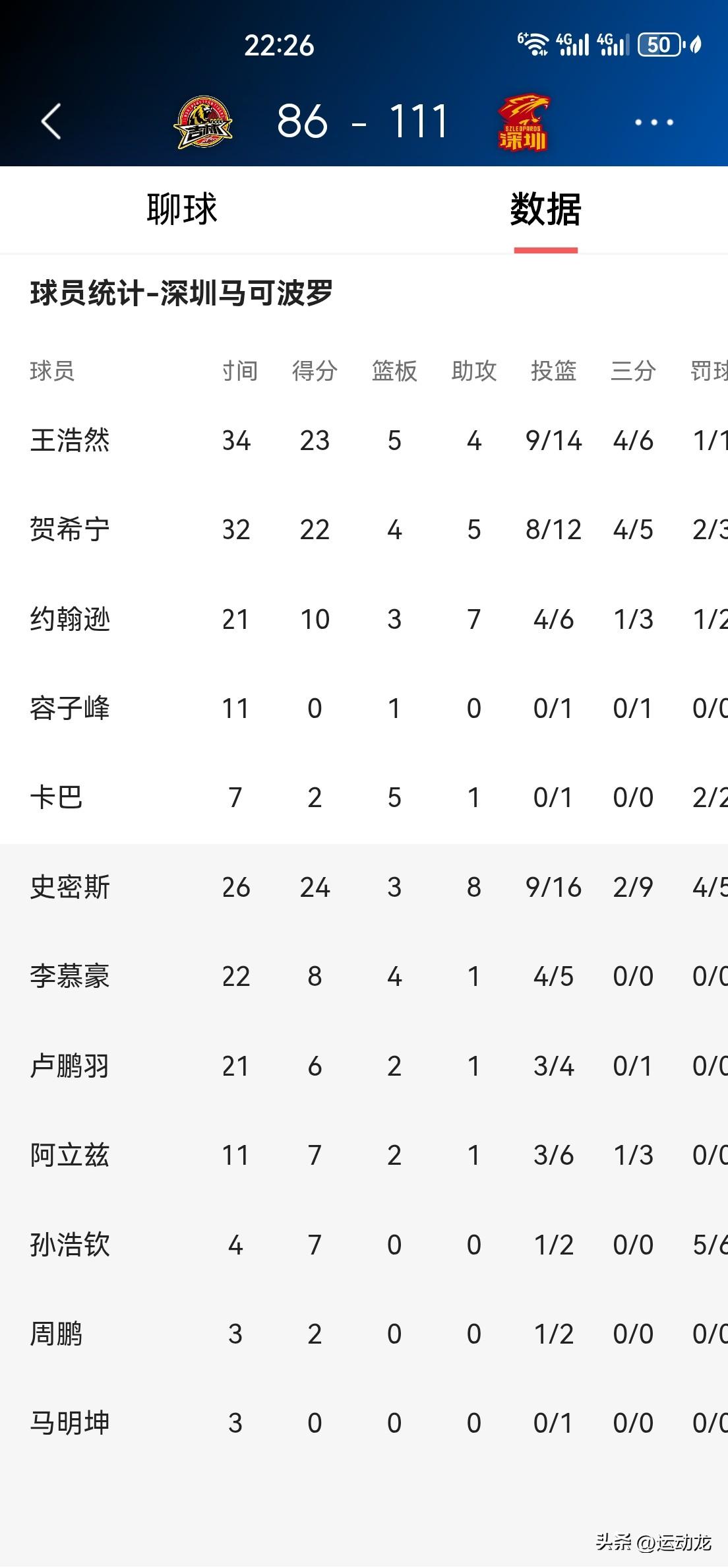 双子星闪耀,深圳队攻陷长白山“巨人杀手”主场,挤身排名榜前四。 本场比赛,深圳队双子星贺希宁、王浩然表现出色,继续高效输出。贺希宁出战32分钟,12投8中,三分球5中4,罚球3中2,砍下22分4篮板5助攻1抢断,正负值+22。 王浩然上场34分钟,14投9中,三分球6中4,罚球1中1,拿到23分5篮板4助攻1抢断1盖帽的全能数据,正负值+19。 本场比赛深圳队反客为主,一开场就在攻防两端压制住吉林队,进攻端火力全开,里外开花,单节轰下34分。防守端十分强悍,让对手屡屡无功而返,仅拿到15分,首节比赛34:15领先吉林19分,奠定胜利基础。第二、第三、第四节比分分别为24:28、 31:24、21:19,最后深圳队客场111:86,大胜主场连续战胜北京北汽和广东宏远的“巨人杀手”吉林队。