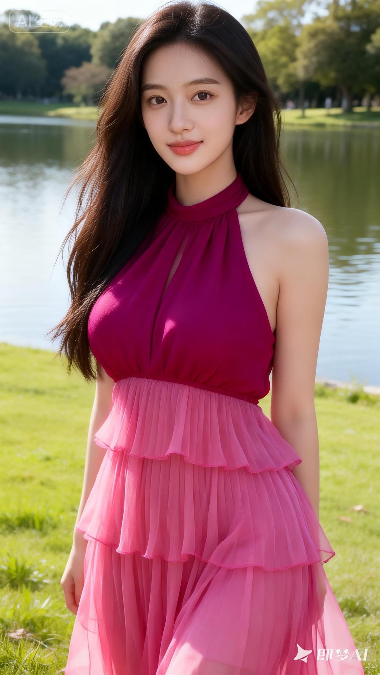 在湖边漫步,粉色裙摆随风飘扬,少女心满满的一天🌸💕