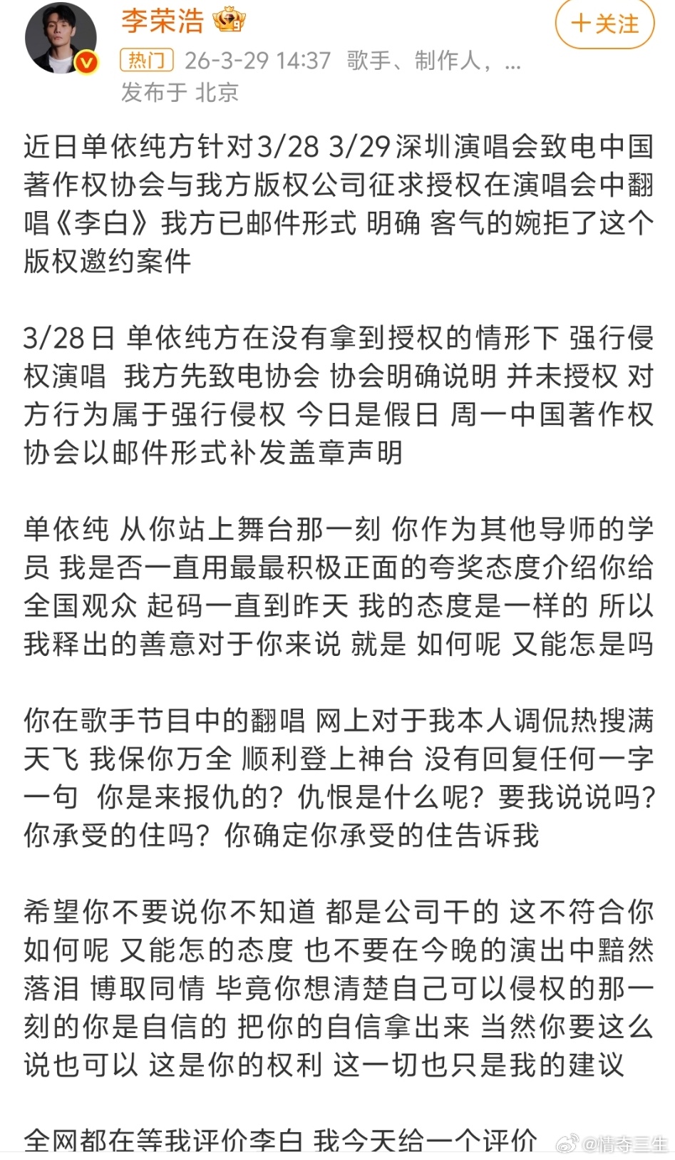 :真应了那句话,可以是原唱,也可以是原告…李荣浩4连质问单依纯