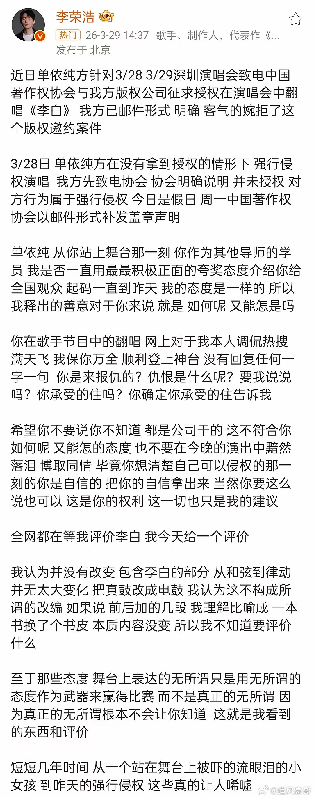 李荣浩指控单依纯侵权李荣浩发长文开撕单依纯,称单依纯强行侵权,喊话单依纯不要甩锅给公司,这文字读下来有种老实人被逼急了感觉!刚刚李荣浩罕见发长文,足足写了近一千个字,接连几个问句质问单依纯:你是来报仇的吗?仇恨是什么呢?要我说说吗?你承受的住吗?看来双方还有些私人恩怨啊,李荣浩这次态度很强硬看来真是生气了,还挺喜欢单依纯的,希望她不要让歌迷失望!