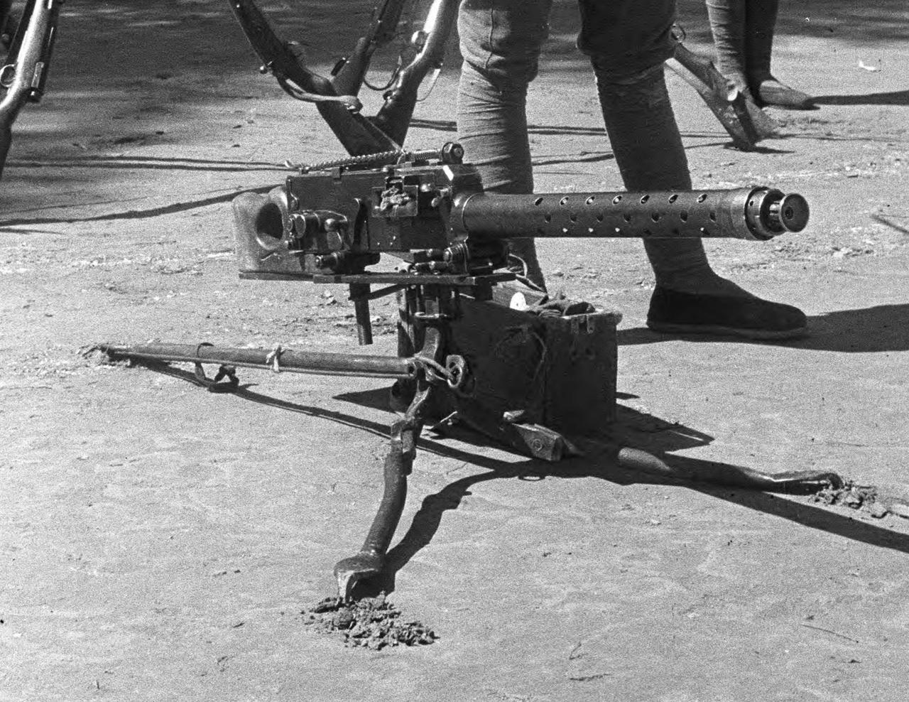 这是八路军展出的一挺重机枪,是从日军那里缴获得来的。这是一挺很奇特的机枪,枪管很粗大,上面布满了散热孔。它配有三脚架,最奇特的是它的枪托,是一根有一个大洞的木头。它不像我们经常在电视剧上看的日军九二式重机枪或者是歪把子机枪,它到底是什么机枪?