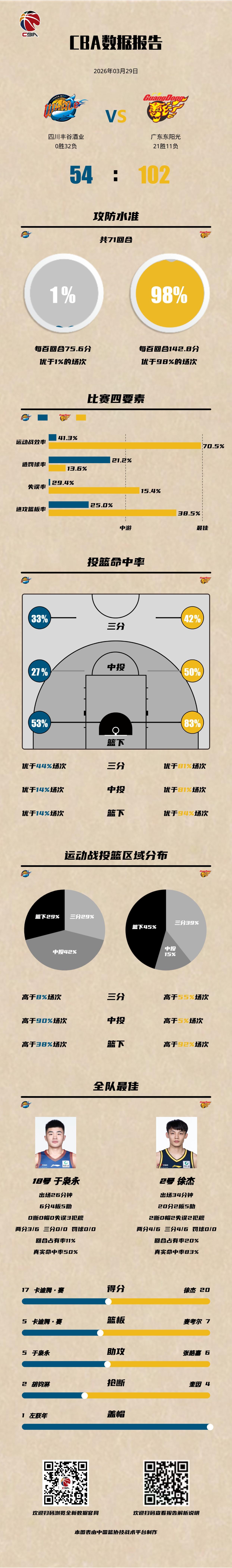 四川丰谷酒业 54-102 广东东阳光四川男篮vs广东男篮 四川丰谷酒业:卡迪姆·赛17分5篮板,张力升9分,李玮颢8分; 广东东阳光:徐杰20分5助攻2抢断,奎因17分3篮板4抢断,陈家政15分4篮板4助攻。以城之名