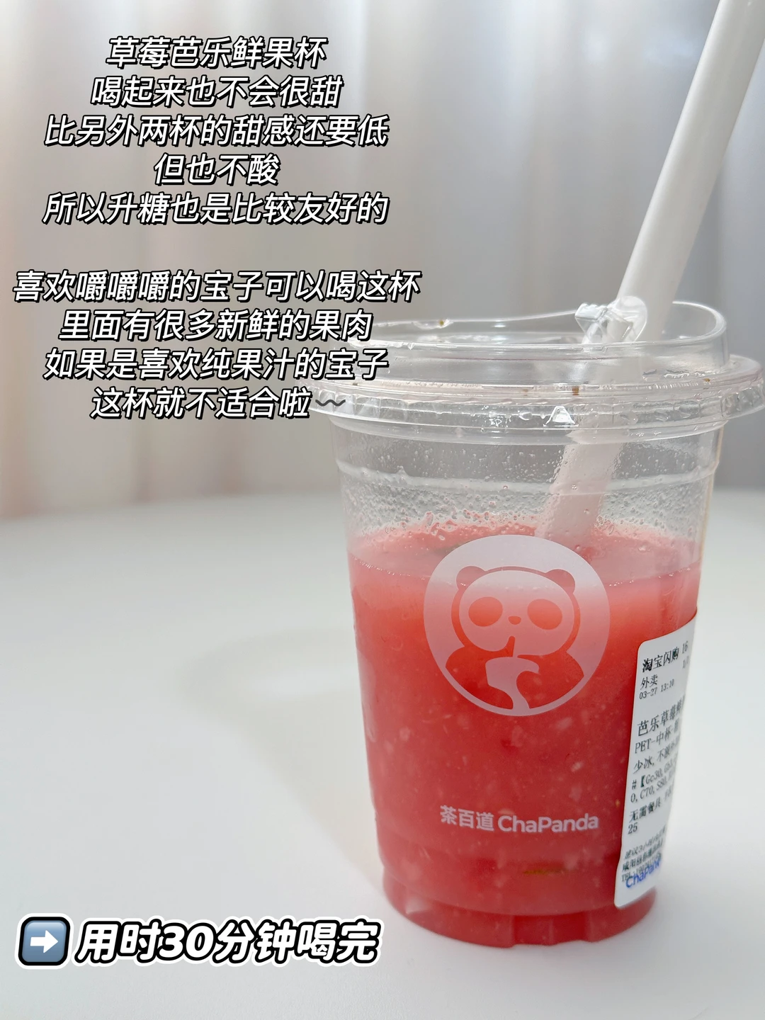 草莓芭乐鲜果杯,喝起来也不会很甜,比另外两杯的甜感还要低,但也不酸,所以升糖也是比较友好的〰️喜欢嚼嚼嚼的宝子可以喝这杯,里面有很多新鲜的果肉,如果是喜欢纯果汁的宝子,这杯就不适合啦〰️