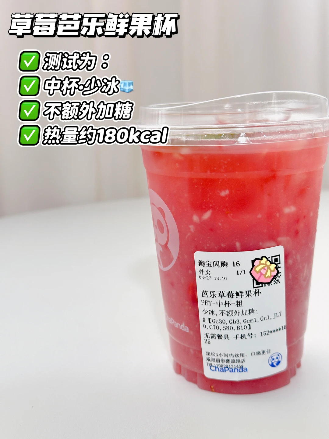 测试为:中杯·去冰🧊不额外加糖 约180kcal