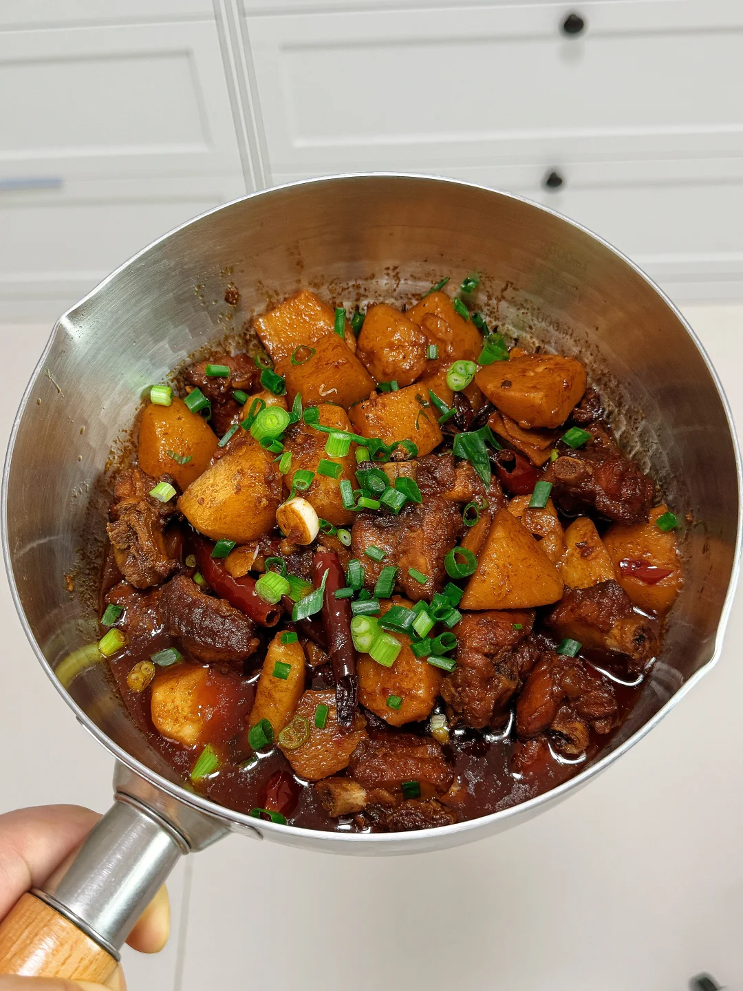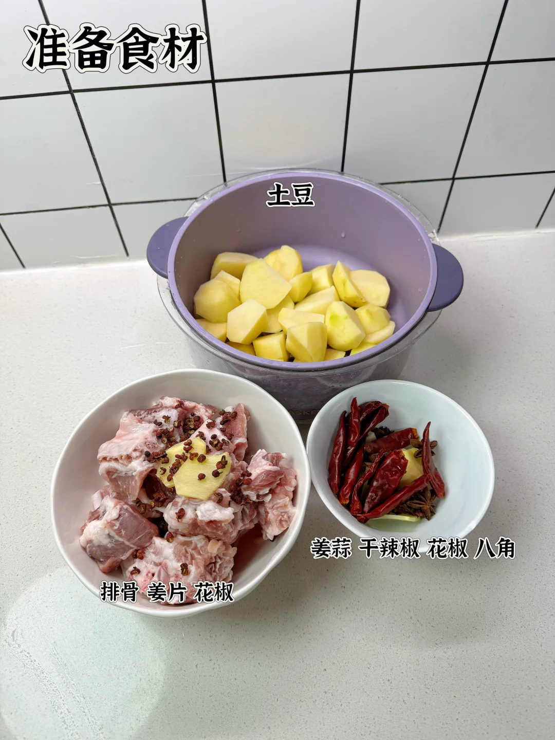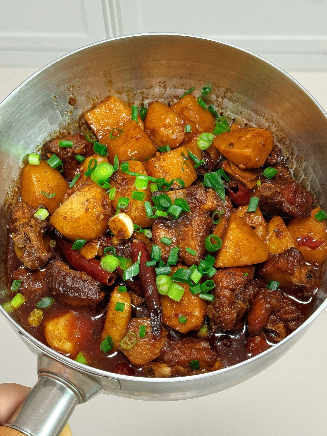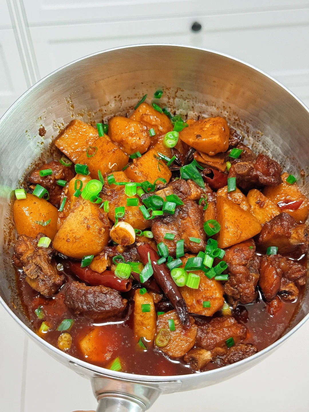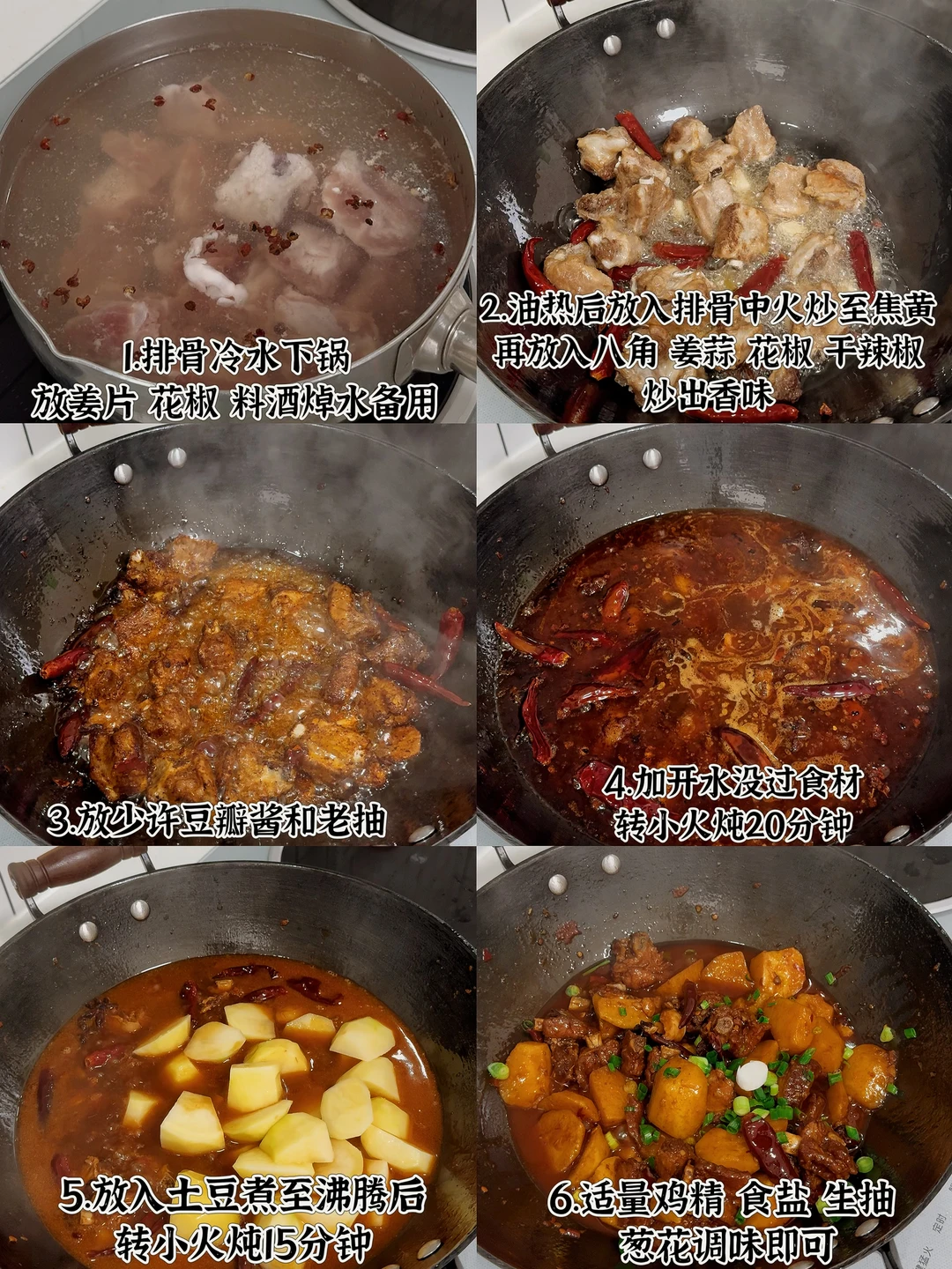 📜食材:土豆、排骨 🍳做法: 1.排骨洗干净冷水下锅,放姜片、花椒、料酒焯水备用 2.油热后放入焯水后的排骨,中火炒至焦黄 3.放入姜蒜、花椒、干辣椒、八角炒出香味 4.放少许豆瓣酱、老抽,翻炒均匀 5.加入适量开水,煮至沸腾后转小火焖煮20分钟 9.放入土豆煮至沸腾后,转小火焖煮15分钟 7.放适量鸡精,食盐,生抽、葱花调味即可。