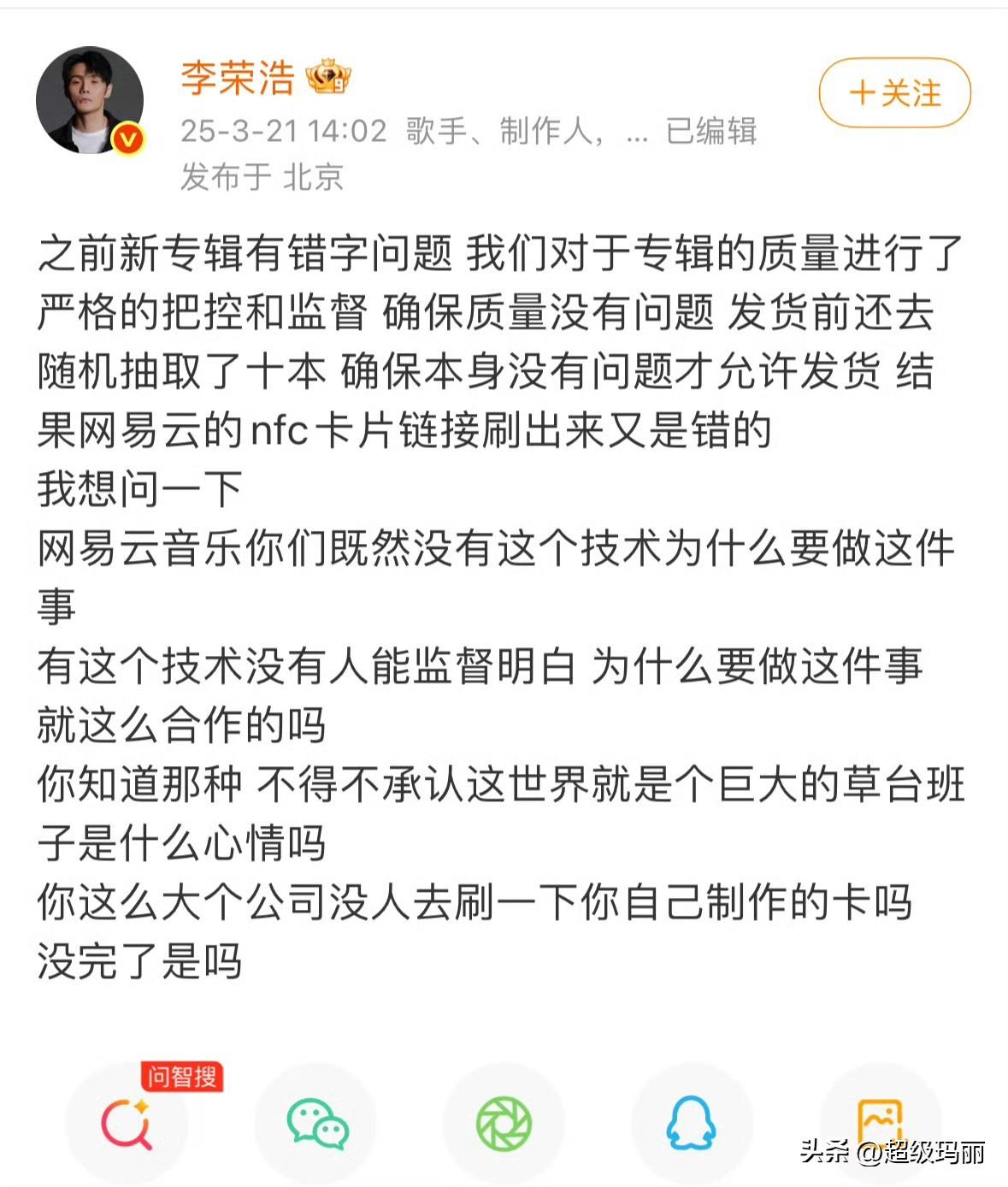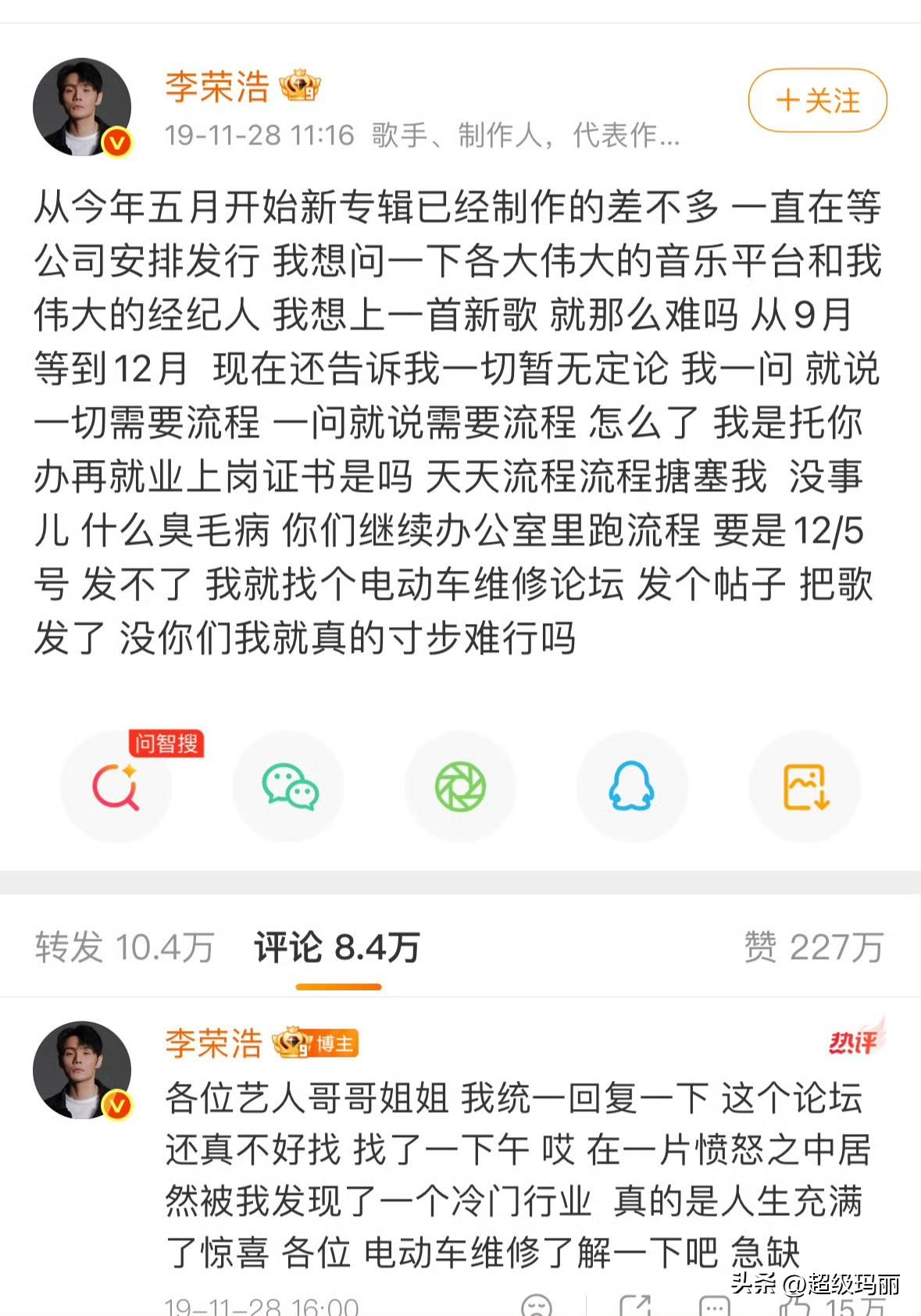 哈哈哈……虽然李荣浩 好惨,但哥怼人真的又有逻辑又好笑,每次都精准戳中还不伤人幽默值拉满,我要被他的嘴圈粉了[笑哭]尤其吐槽物业这个实在太好笑了,不愧是创作人,有理有据,一气呵成,每个字都能感受到他的情绪[捂脸] 《电动车维修论坛发歌》 《网易云音乐草台班子》 《物业爱好者不要diss我》 《转发过万其中自己转了7000》 要点 1.一定要搞幽默 2.一定不加标点符号