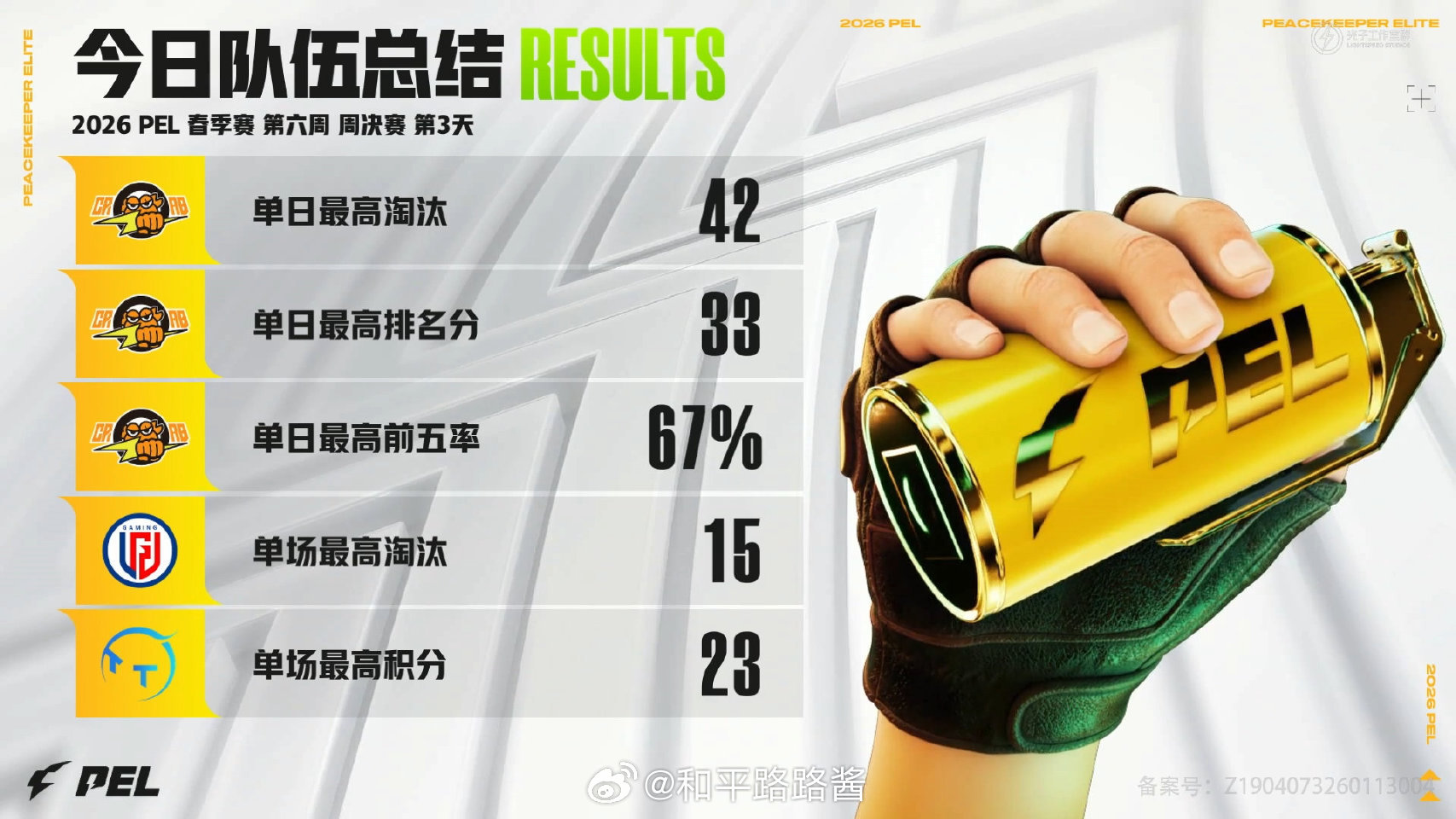队伍数据:单日最高淘汰:42单日最高排名分:33单日最高前五率:67%单场最高淘汰:15单场最高积分:23