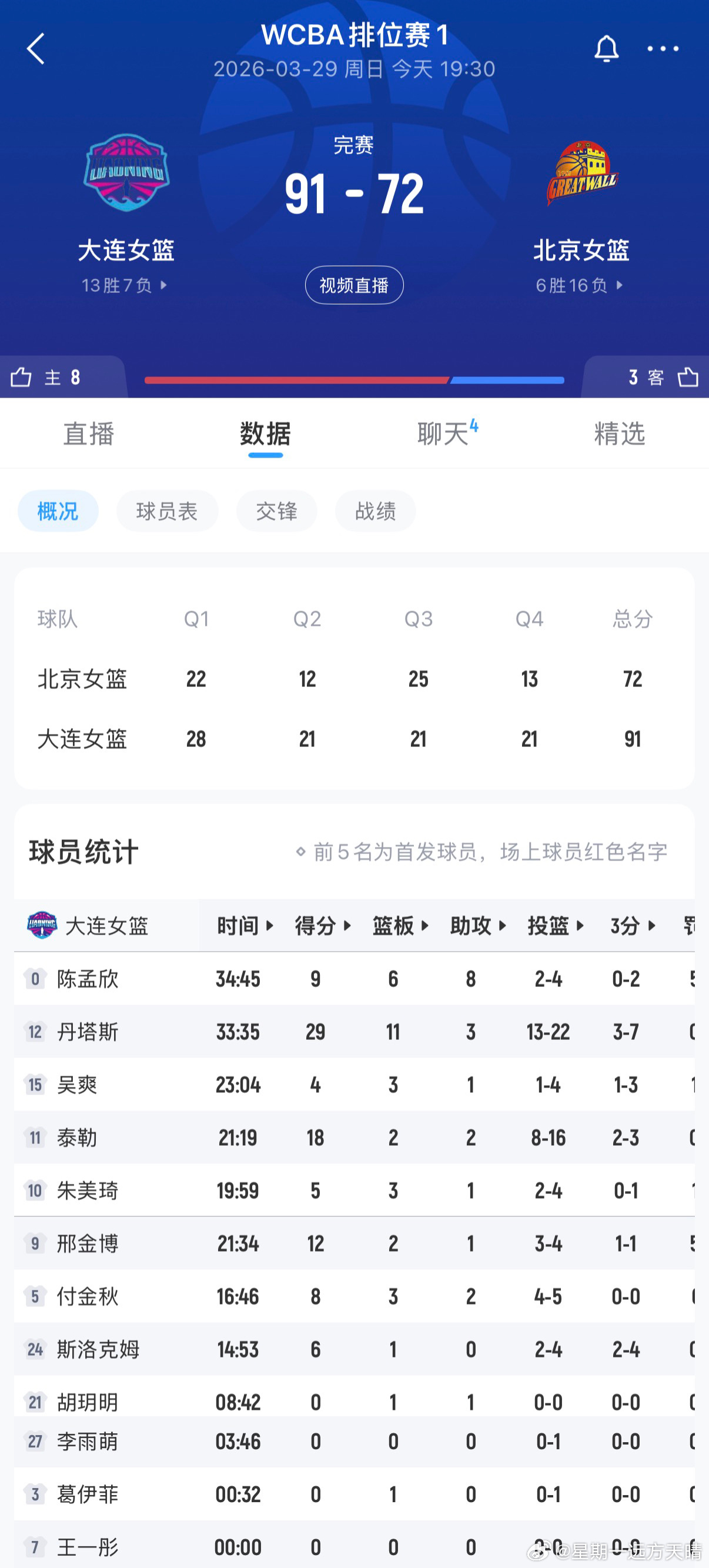 辽宁女篮季后赛第一场辽宁91:72北京赢下第一场胜利!!!辽宁全程领先,除了第三节在裁判的努力下有追分的势头,但是都凭辽宁的自身实力按回去了。还有就是我们的大外援丹尼斯太强了!