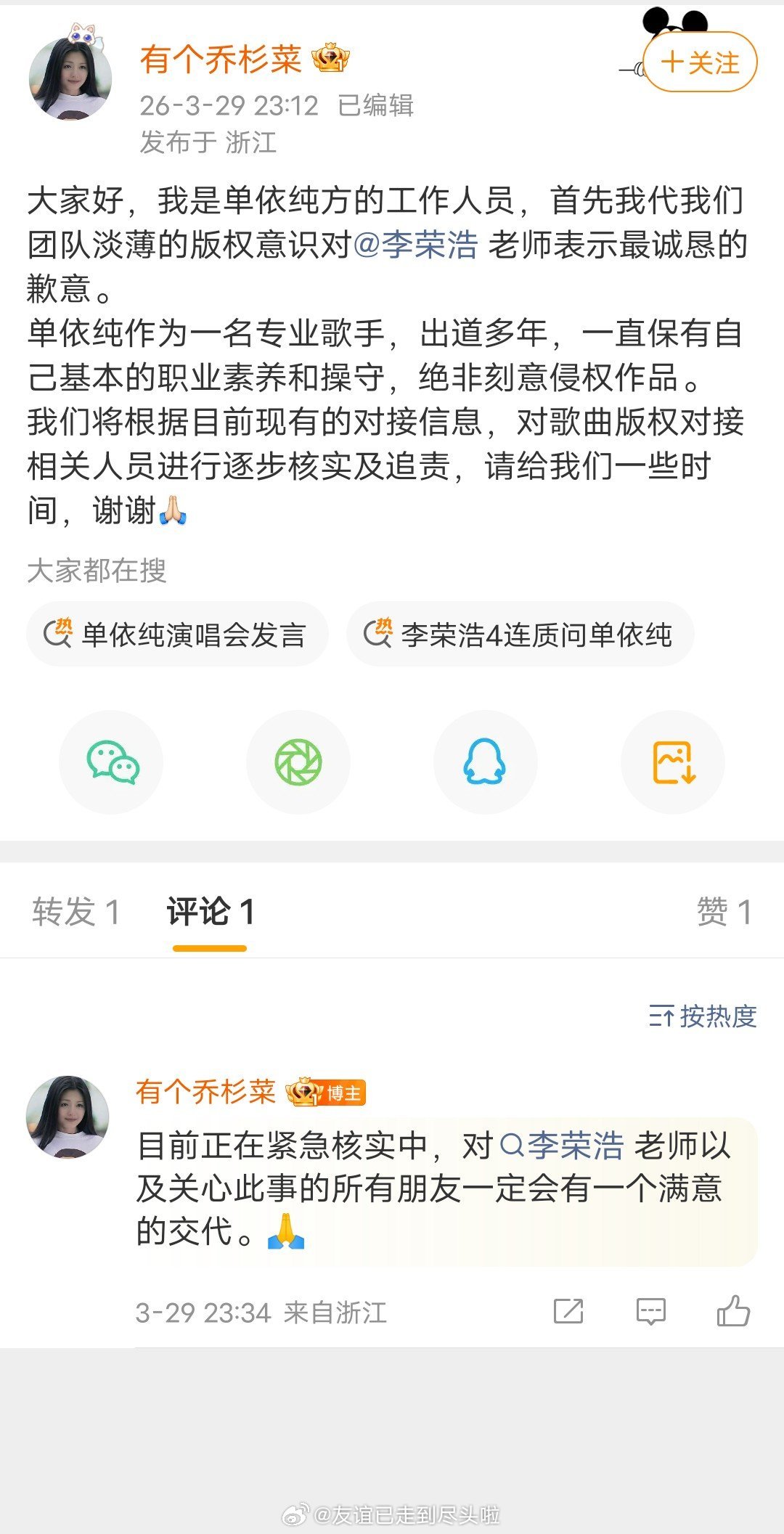 疑似单依纯方工作人员回应,承认侵权了,但强调单依纯绝非刻意侵权作品。给李荣浩道歉了,表示会严肃追责歌曲版权对接相关人员。这个是真的假的?为什么不用单依纯本人或者工作室的账号回应。李荣浩4连质问单依纯单依纯演唱会发言李荣浩 单依纯强行侵权