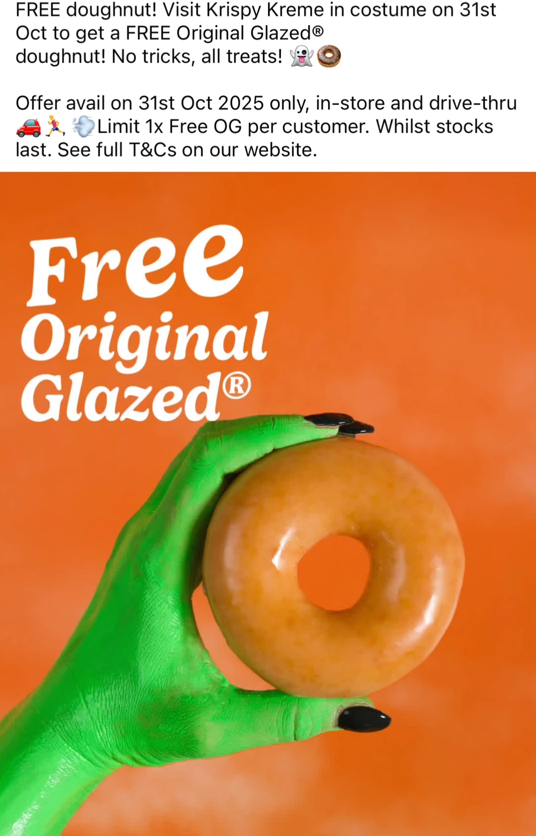 10月31日万圣节当天,只要穿着costume到店或drive-thru,即可免费获得一个经典糖霜甜甜圈!