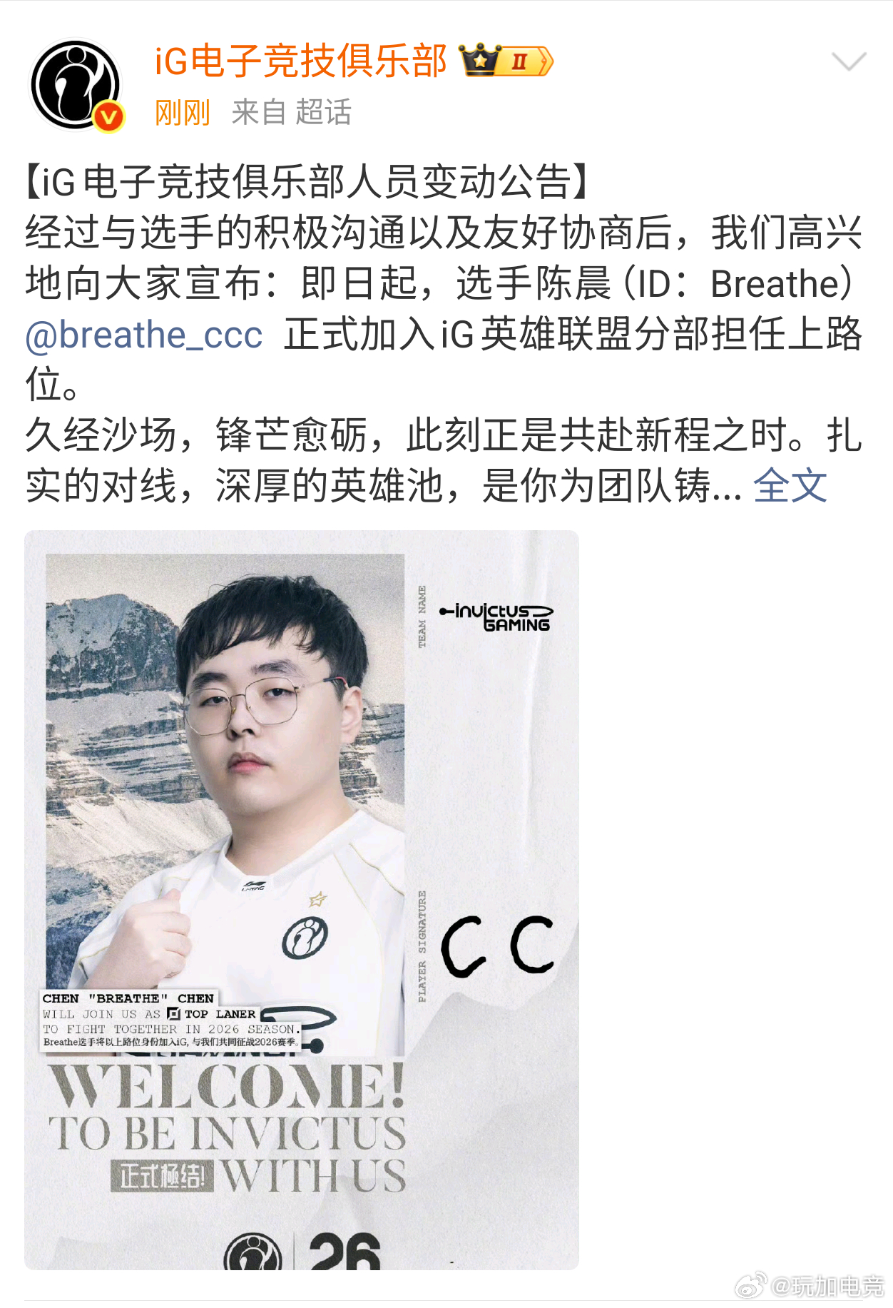 iG官宣Breathe加入Breathe加入iG