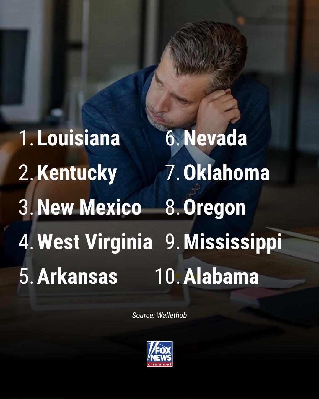 一项新研究确定了美国压力最大的十个州。该研究比较了全美50个州的压力水平,分析了包括工作、金钱、家庭和健康在内的40种不同的压力指标。 美国压力最大的十个州: 1.路易斯安那州 2.肯塔基州 3.新墨西哥州 4.西弗吉尼亚州 5.阿肯色州 6.内华达州 7.俄克拉荷马州 8.俄勒冈州 9.密西西比州 10.阿拉巴马州