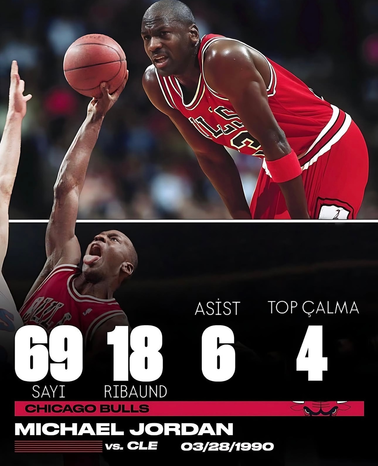 篮天下1990年公牛队客场对阵骑士队,被激怒的Michael Jordan砍下69分18篮板6助攻4抢断!