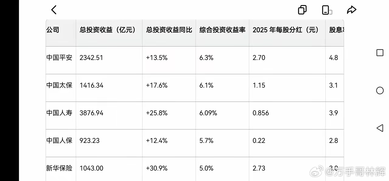 中国平安、中国太保、中国人寿、中国人保和新华人寿均已公布2025年投资业绩,投资收益均创历史新高,那谁又是投资端的王者呢?综合投资收益率方面,中国平安领跑,为6.3%。总投资收益方面,国寿规模第一,为3877亿元;新华增速称王,为30.9%。股息率方面,平安最高,为4.8%。1.综合投资收益率:平安领跑,太保、国寿紧随。综合投资收益率(含公允价值变动)最能反映真实投资能力,按照高低排列如下:- 中国平安:6.3%- 中国太保:6.1%- 中国人寿:6.09%- 中国人保:5.7%- 新华保险:5.0%2.总投资收益:国寿规模第一,新华增速称王,排列如下:- 中国人寿:3876.94亿元(规模第一),同比+25.8%- 中国平安:2342.51亿元,同比+13.5%- 中国太保:1416.34亿元,同比+17.6%- 新华保险:1043亿元,同比+30.9%(增速第一)- 中国人保:923.23亿元,同比+12.4%3.股息率:平安最高,而且多年保持稳定。排列如下:- 中国平安:2.70元/股,股息率4.8%(第一)- 中国人寿:0.856元/股,股息率3.9%- 中国太保:1.15元/股,股息率3.1%- 新华保险:2.73元/股,股息率3.0%- 中国人保:0.22元/股,股息率2.8%4.投资价值怎么看?- 高股息:中国平安(收益率第一、股息率第一)- 规模:中国人寿(收益规模第一、收益率第三)- 高成长:新华保险(增速第一) - 均衡稳健:中国太保(收益率第二、增速稳健)