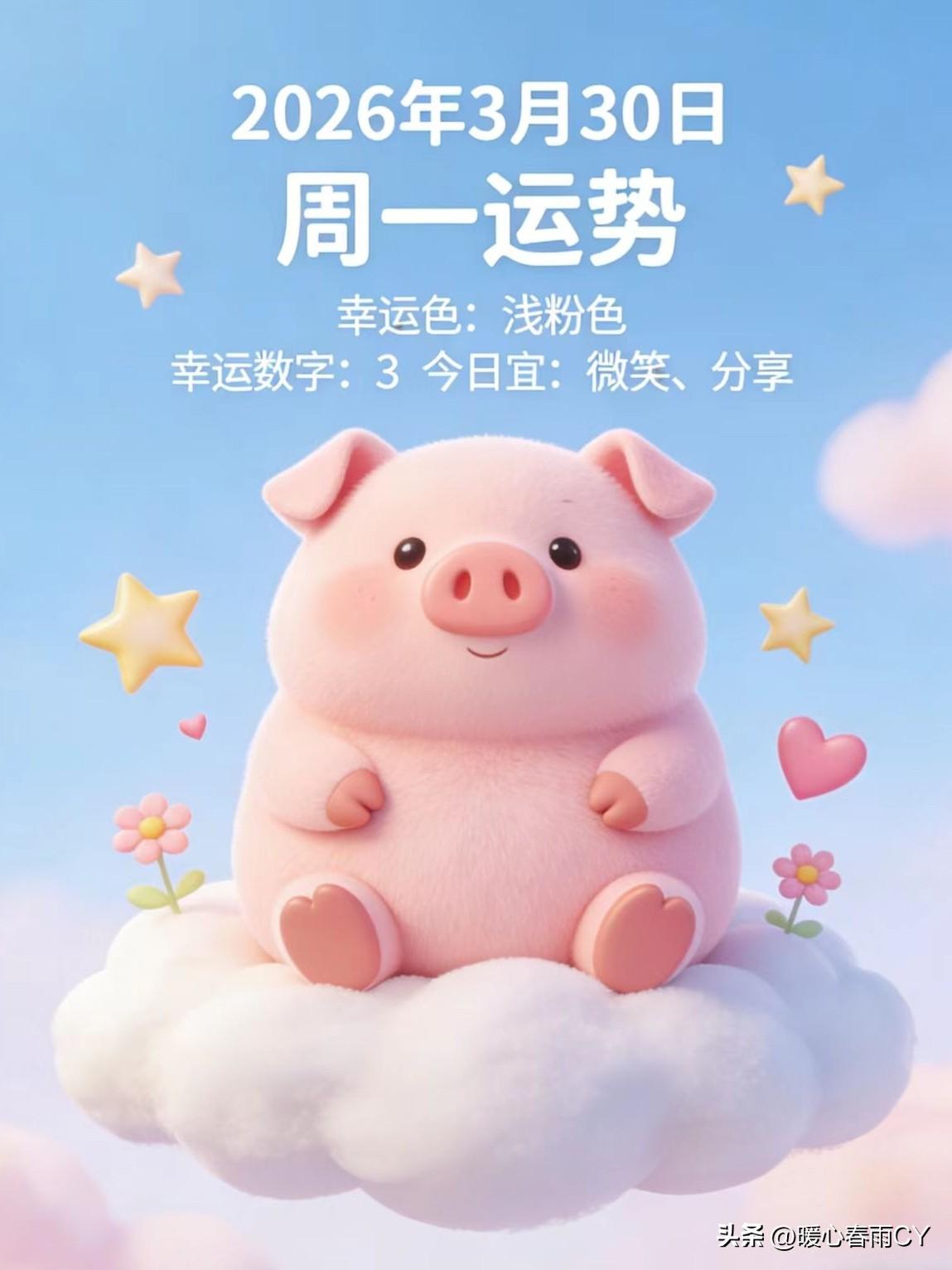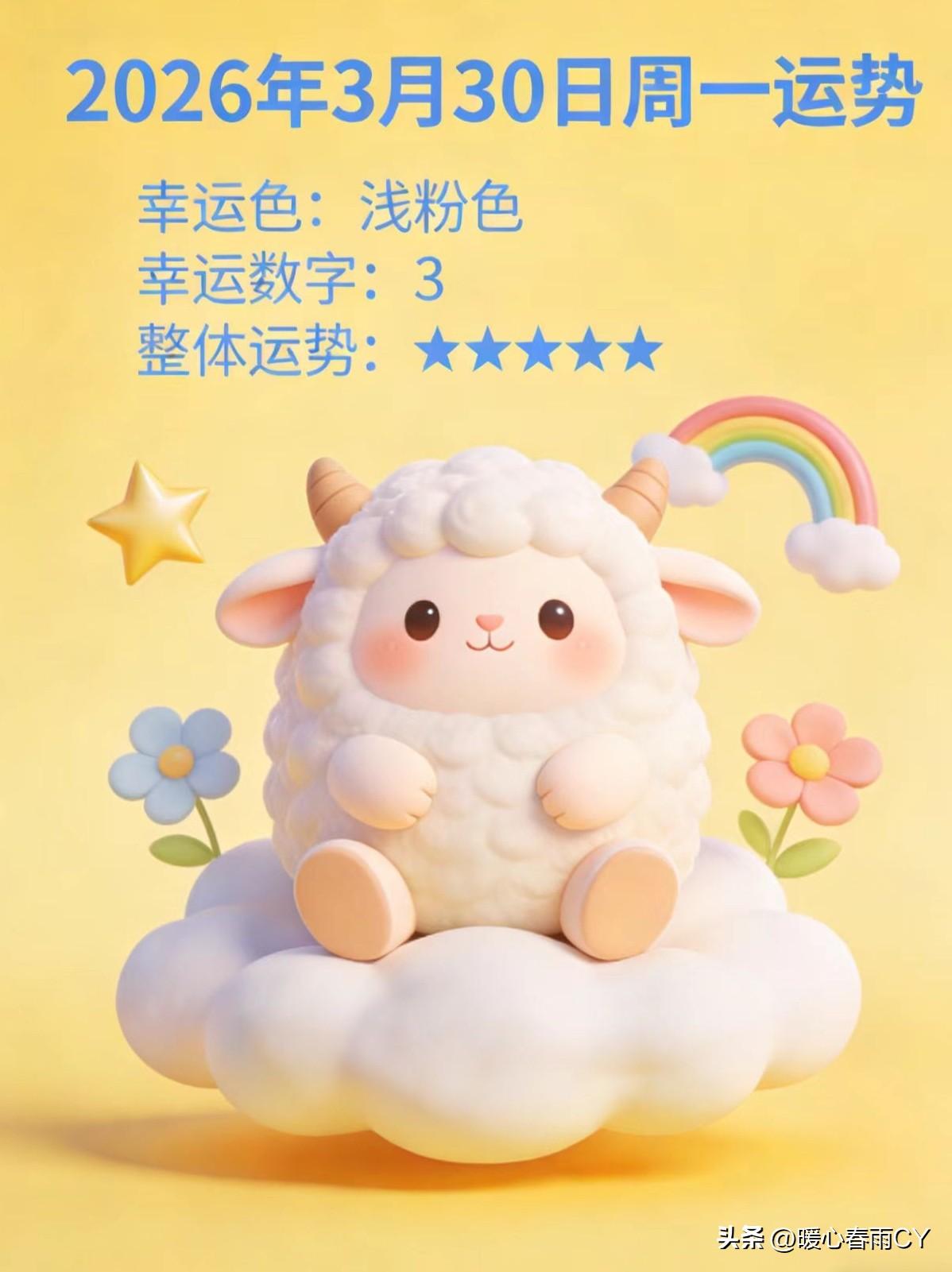 🔥 3月30日 周一运势 | 属马本命年必看,生肖星座解析 ☁️ 🤺 周一综合症退散!☀️新的一周,从接住好运开始! 🏮 今日运势核心:稳中有升,心态为王! 属马的朋友,记得多晒太阳,稳情绪比硬扛更重要!🐎 🐎 属马(双重本命年) 情绪容易波动,人际关系宜降温。切忌自我内耗,桃花虽旺但别冲动,多晒太阳聚集阳气。 ☀️ 生肖运势: 🐶 吉肖:运势超凡 * 属狗:财运大爆发!投资理财有惊喜,单身者桃花正旺,静候脱单。 * 属猪:精力充沛,合作洽谈能遇贵人,整周执行力满格。 * 属羊:人际关系和谐,处世灵活,适合做协调、维系关系的工作。 🐔 慎肖:稳住莫躁 •属鸡:今日冲煞,忌往西方出行,大事暂时搁置,以休息为主。 •属鼠:容易焦虑疲惫,先调养精神再谈事业,不要过度操劳。 ⭐️ 星座运势 顶配组 狮子:新计划可启动,午后适宜谈钱、合作。 射手:专注度十足,少管闲事少惹麻烦,专注自身就获胜。 金牛:有金星加持,若想变美,适度消费都OK。 🌧 需稳心态主组 双子:别被困难劝退,感情好好沟通,问题能够解决。 巨蟹:别纠结,有需求就开口,听听他人的建议可少走弯路。 周一通用专属吉时与方位 签约吉时:07:00 - 09:00 纳财吉时:15:00 - 17:00 幸运方位:正南、东南 接住周一好运 💐 评论区留下你的星座/生肖,接住属于你的周一好运气!(来我主页喝茶🍵) 天南地北大拜年 我要上精选-全民写作大赛本命年十二生肖