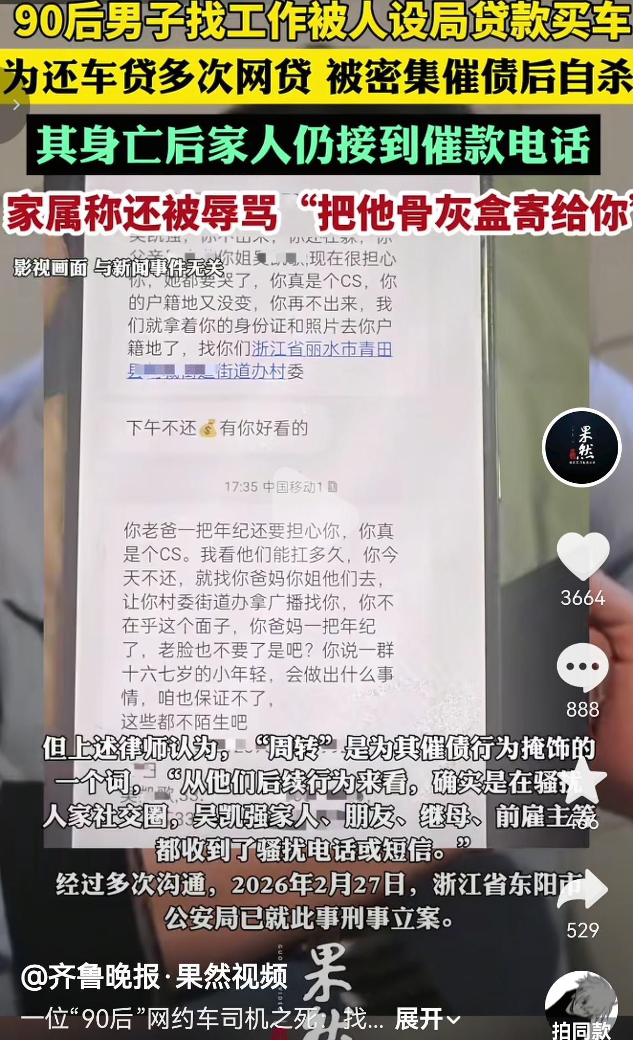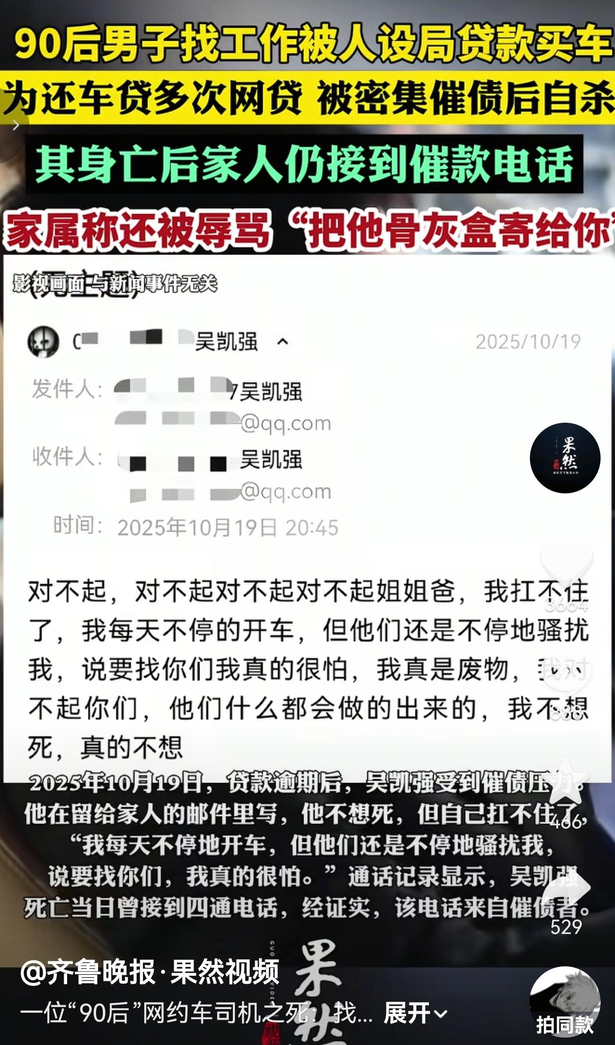 这哪里是催债,这是赤裸裸的索命! 33岁的吴凯强,在职场摸爬滚打整整10年,做过合同工、学过设计、进工厂打过工,一辈子都在踏踏实实过日子,从没做过一件亏心事。 2024年6月失业后,他不想给家人添负担,瞒着所有人想找份网约车司机的工作,想靠自己的力气重新赚钱养家,结果却被黑心团伙狠狠设了局——对方以“入职必须买车”为幌子,连哄带骗让他签下高额车贷,直接把他拖进了万劫不复的无底洞。 为了还上每月压得人喘不过气的车贷,他走投无路只能一次次向网贷平台伸手,债务窟窿越补越大,根本看不到头。 他拼了命地跑车,每天天不亮就摸黑出门,跑到深夜凌晨才敢收车,连口热饭都顾不上吃,可那些催债电话还是像索命的厉鬼,24小时不间断地打进来,不分白天黑夜,连片刻的安宁都不肯给他。 2025年10月19日,这个善良的男人终于扛不住了。在发给家人的最后一封邮件里,他一遍遍地道歉,字里行间全是绝望和愧疚:“我不想死,真的不想,但他们要找你们,我真的很怕,我不想连累家里人……”那天他接连接了四通催债电话,每一句都像刀子扎在心上,最后他把车开到母亲长眠的公墓附近,选择用喝农药、割腕的决绝方式,结束了自己被债务彻底碾碎的一生。 更让人窒息、更让人怒火中烧的是,他人都已经走了,催债的家伙还不肯放过他的家人! 离世5天后,一个操着外地口音的男人打电话给他姐姐,张嘴就是满嘴脏话,更是丧心病狂地叫嚣“把他骨灰盒寄给我”,还恶狠狠地威胁要去他老家闹事,要让全村人都知道他“欠钱不还”。 后续他的父亲、姐姐、继母,甚至连之前的老雇主,全都被这群催债的轮番骚扰,短信里全是不堪入目的辱骂,极尽恶毒地诋毁他的人品,还要让他年迈的父母老脸丢尽。 一开始家人报警求助,得到的回应是“催收只是问问能不能周转”,并未及时介入处理,直到这件事被曝光引发舆论发酵,2026年2月,浙江东阳公安才终于对这起案件刑事立案。 可一条鲜活的人命,一个原本完整家庭的彻底破碎,到最后换来的,却只是一句迟来的“立案调查”。 有网友评论道:“我也被网贷催收折磨过,那种每天被电话轰炸、不敢接电话、不敢看短信,走到哪都提心吊胆的恐惧,真的能把人逼疯!他不是不想活,是被这群家伙逼得无路可走了!” 也有的网友说:“人都已经没了还不放过?这哪是正规催收,这就是吃人不吐骨头的恶鬼!必须严惩不贷,让这些丧尽天良的人把牢底坐穿!” 还有的网友说:“找工作被骗贷,这根本就是精心设计的诈骗!为什么一开始不能及时介入,非要等出了人命才重视,普通人的命就这么不值钱吗?” 也有的网友说:“把他骨灰盒寄给你”,说这话的人良心被狗吃了吗?半夜就不怕做噩梦,不怕遭报应吗?简直没有一点人性!” 我真的越写越恨,越写越心疼! 吴凯强从来不是什么老赖,他只是一个想踏踏实实赚钱、想好好活下去的普通人,是一个怕给家人添麻烦、连死都要一遍遍道歉的老实人。 他的悲剧,从被骗子哄骗签下车贷的那一刻就注定了,一边是望不到头的沉重债务,一边是无孔不入的暴力催收,一边是怕拖累家人的深深愧疚,这三重枷锁死死勒着他,把他活活逼上了绝路。 更让人心寒到骨子里的是,那些催债的人明明知道他已经离世,却还要对着他悲痛欲绝的家人撒野,用最恶毒的语言往他们的伤口上撒盐,他们根本不是真心想要回款,就是在享受把人踩在脚下、肆意凌辱的快感,半点人性都没有! 我们总说要好好活着,可当一个普通人被债务、催收、冷漠层层围困,连喘口气、歇一下的机会都没有的时候,“好好活着”这四个字,到底有多沉重? 吴凯强的死,从来都不是他一个人的悲剧,而是无数被网贷套路、被暴力催收、被生活压得喘不过气的普通人的真实缩影。 我们要的从来不是一句迟来的立案调查,而是要让那些设局诈骗的、暴力催收的、漠视他人生命的人,全都付出应有的代价!是要让每一个像吴凯强一样努力生活的普通人,在走投无路的时候,能看到一丝希望的光,而不是只剩下绝路一条。 这个世界不该让老实人寒心,更不该让暴力催收肆意妄为,我们发声,是为了逝者,更是为了每一个还在努力生活的普通人,守住最后一份尊严和安全感。 最后,我想说的是:人间纵有万般难,不许暴力摧活人;愿所有善良的人,都能被生活温柔以待,永不被绝望逼至绝境! 对此,你怎么看?