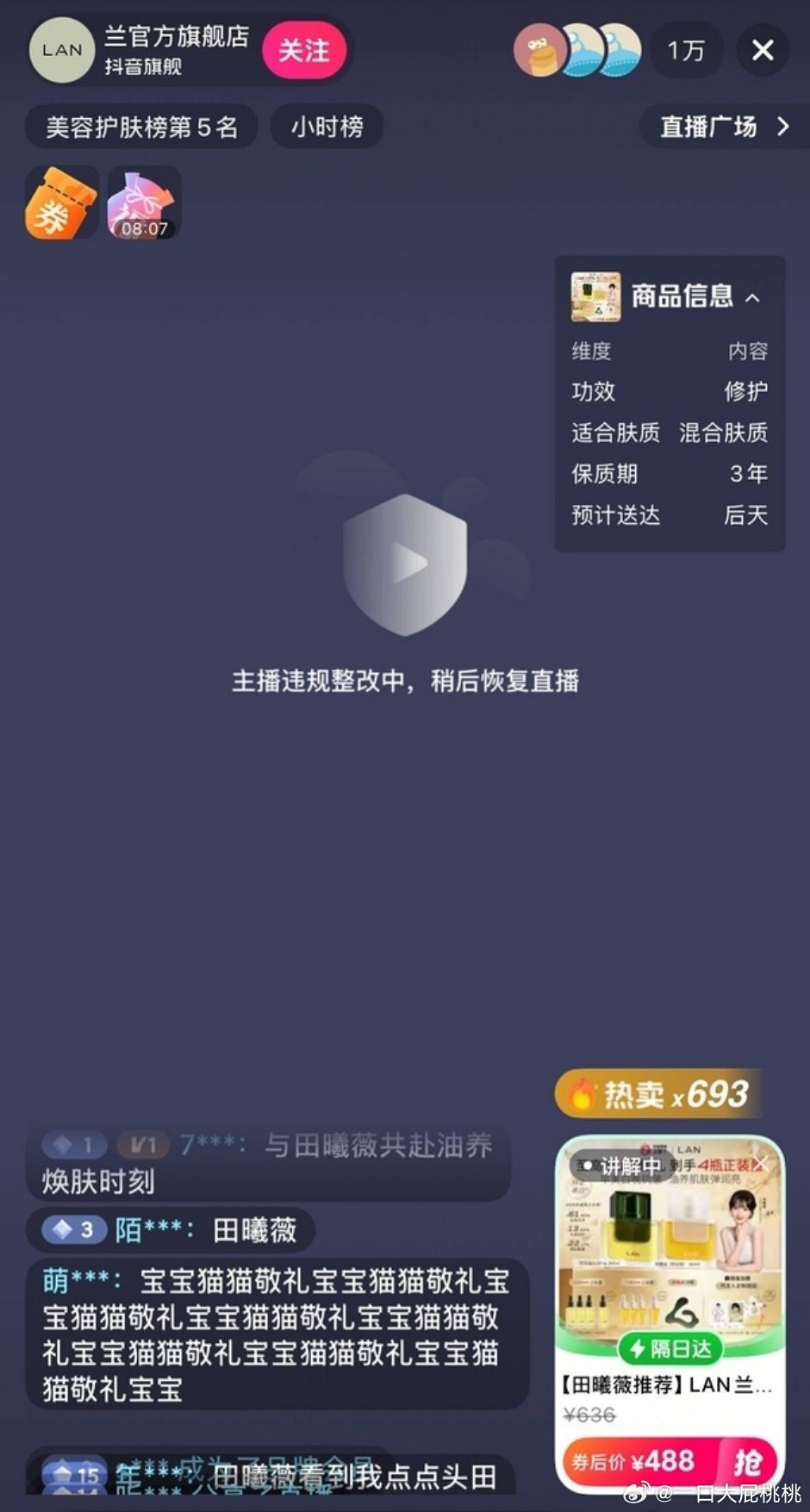 小田因为服装问题直播间被中断了,后面挡住就能开了