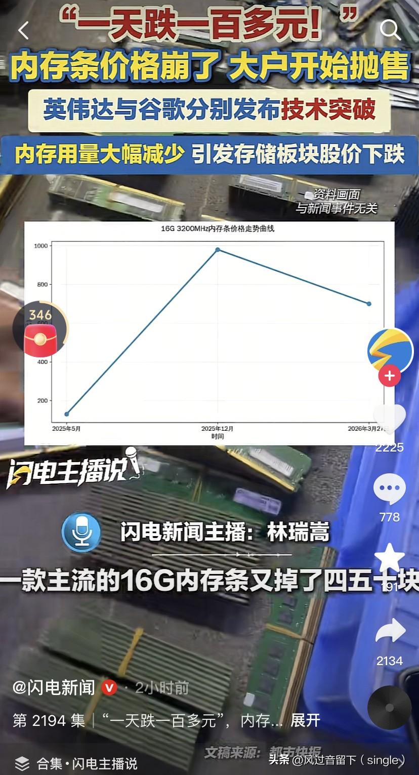 内存条价格崩了,开始掉价了! 由于英伟达和谷歌分别发布技术突破,导致内存用量大幅减少,引发存储板块股价下跌。 内存条不值钱了,而压的货太多了,价格就崩了,赶紧降价,开始抛售。 一些批发商都震惊了,掉价太快了,一个主流的16g的内存条又掉价四五十块,从上周开始都开始掉价,上周六更夸张,就一天掉价100块!但是这也不是刚需,所以很难卖出去! 所以最好的办法就是搞活动了,为了不赔本,赶紧做活动吧,要不就真砸手里了! 毕竟本来不是刚需的就卖得慢,而且那个英伟达和谷歌技术突破第五产品一普及,那这些货就砸手里了,就再也没办法卖了!