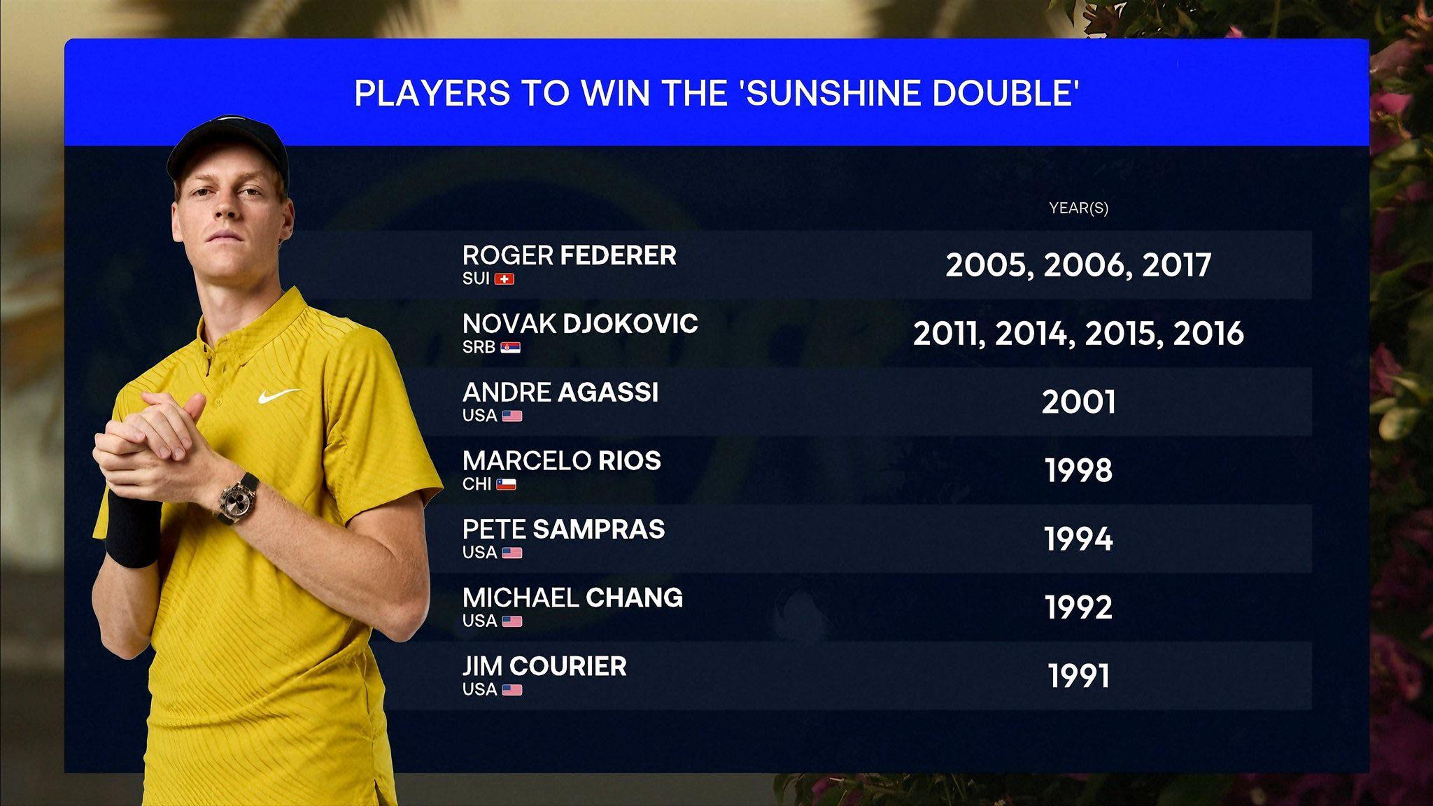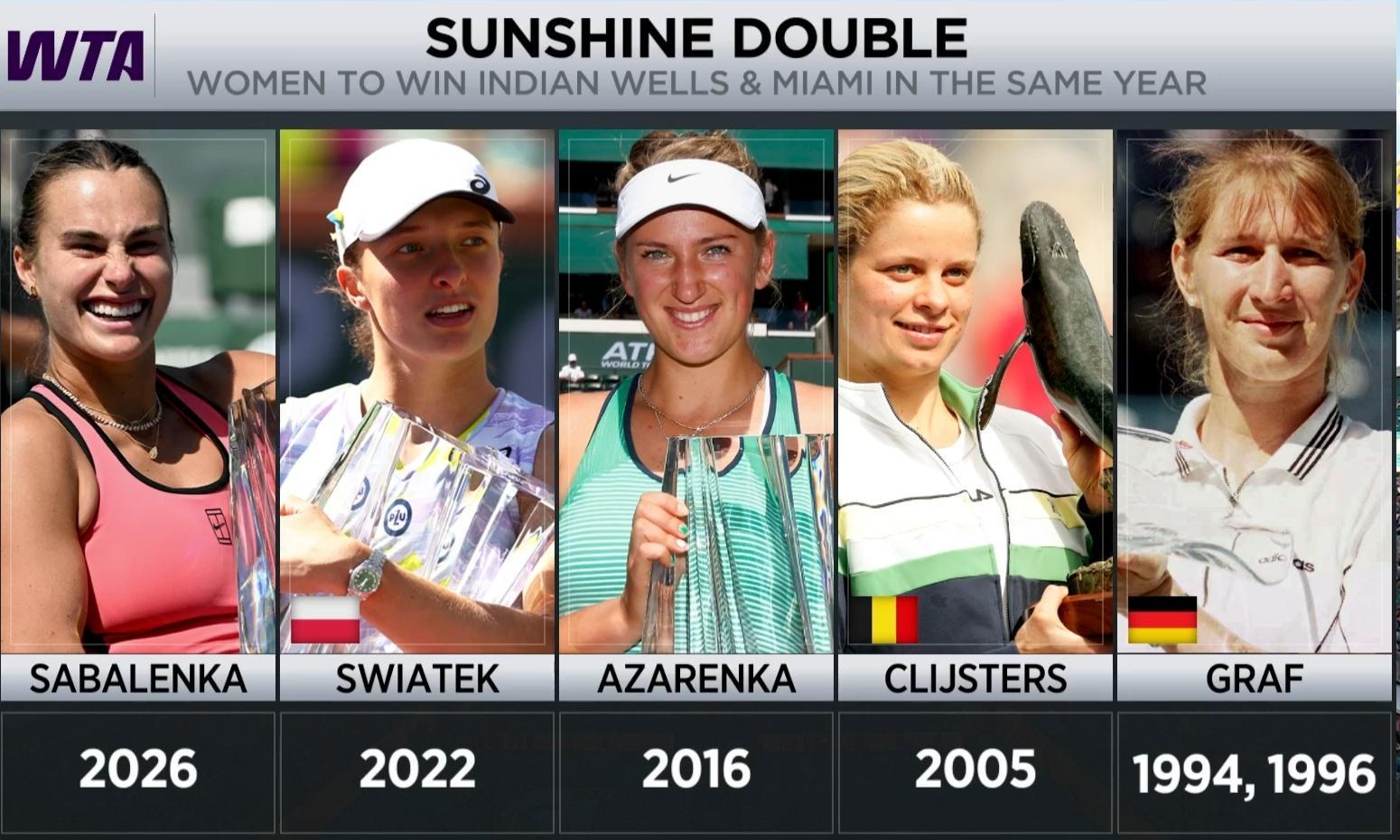 男女同时在迈阿密实现阳光双冠之前仅3次——1994年:桑普拉斯/格拉芙2005年:费德勒/克里斯特尔斯2016年:德约科维奇/阿扎伦卡。