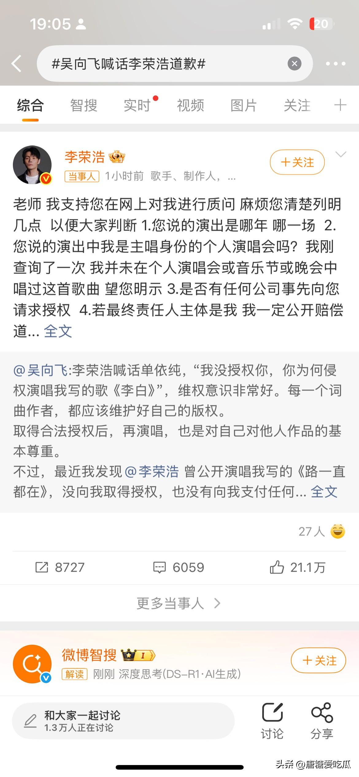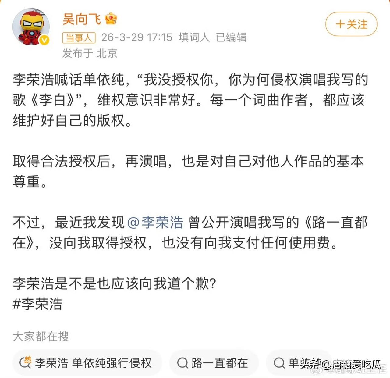 今天最心痛的应该是杨丞琳 她真的劝不住 也不用劝,看到李荣浩正面撕单依纯就知道他火气有多大了,后来又硬刚填词人吴向飞,看着李荣浩这么上头的样子她真的很心痛,同样是音乐人,她太能理解版权纠纷这种事情,但是她也不能下场帮老公让事态变严重,唯一能做的就是支持他,多陪陪他。 这个时候可能就只有杨丞琳能让李荣浩变冷静一些吧。