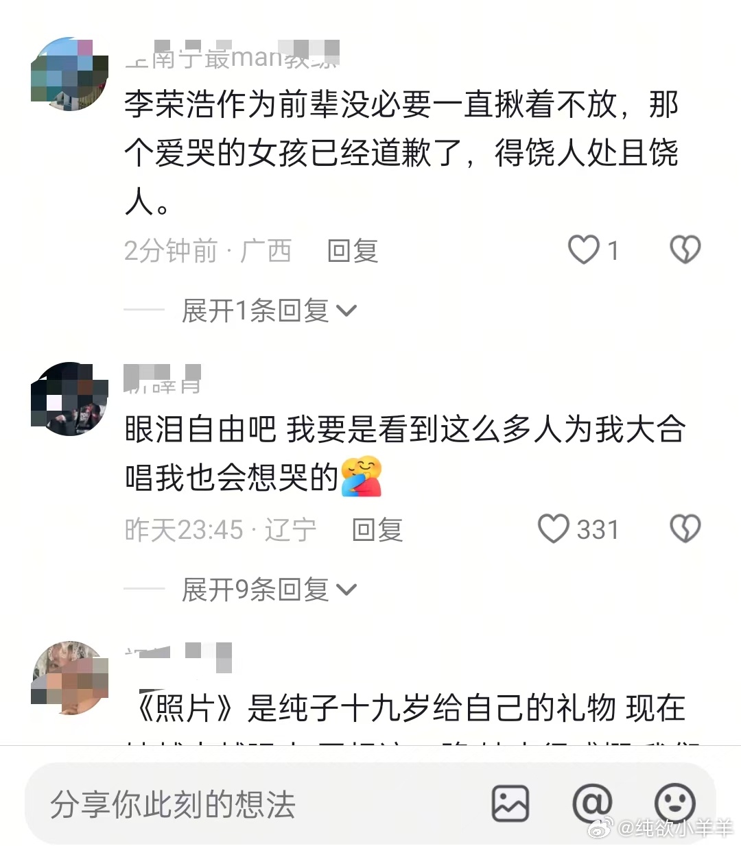 网友让李荣浩得饶人处且饶人 好多网友说李荣浩不应该闹这么大,让他得饶人处且饶人,爱哭的女孩已经道歉