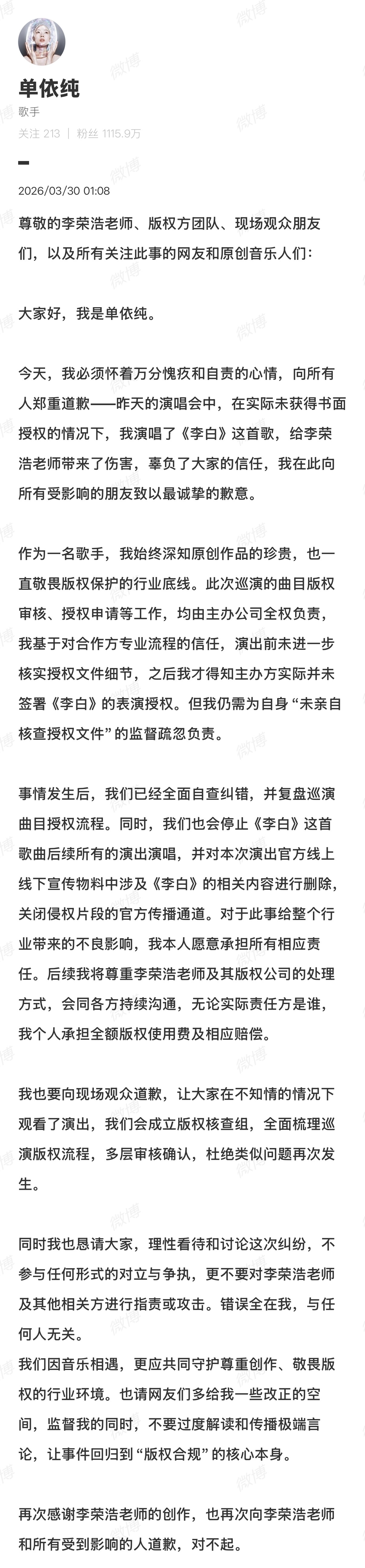 单依纯再次就演唱会未获授权演唱李荣浩《李白》致歉: