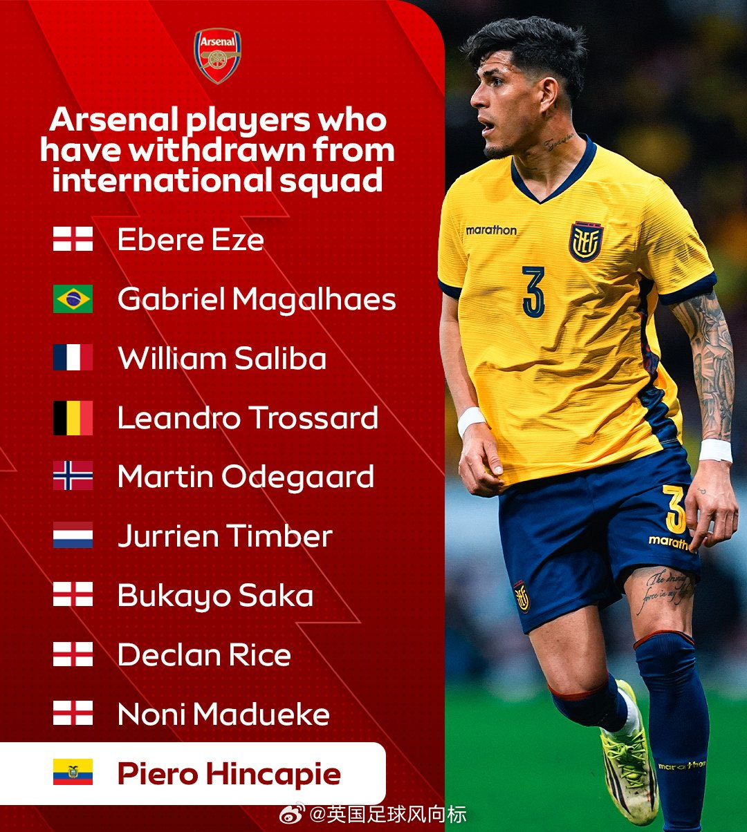 【阿森纳连伤10人】3月份国家队比赛日,阿森纳一共有10名球员先后因伤(预防受伤)退出国家队集训和比赛:埃泽、加布里埃尔、萨利巴、特罗萨德、厄德高、廷贝尔、萨卡、赖斯、马杜埃凯、因卡皮耶。
