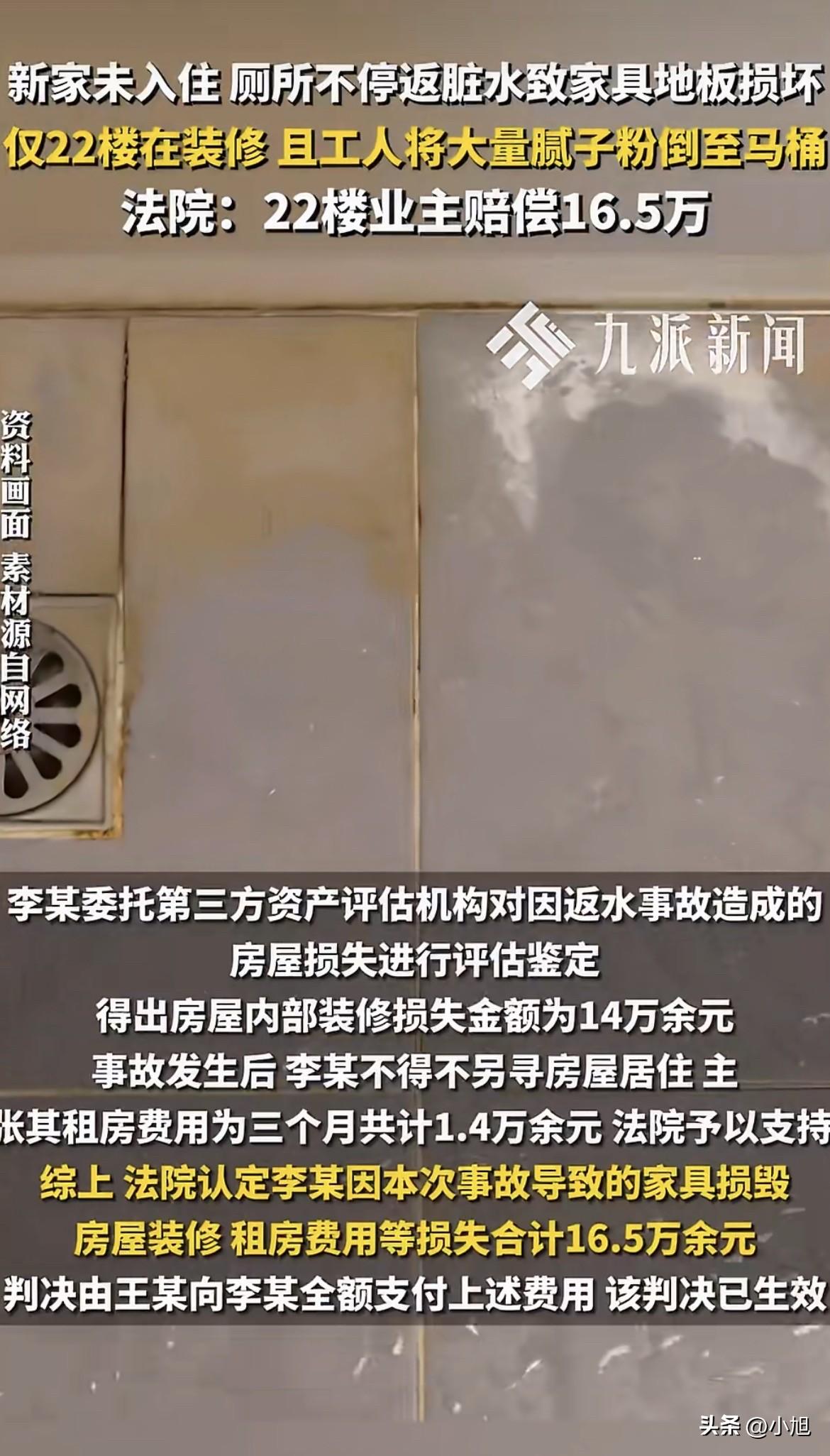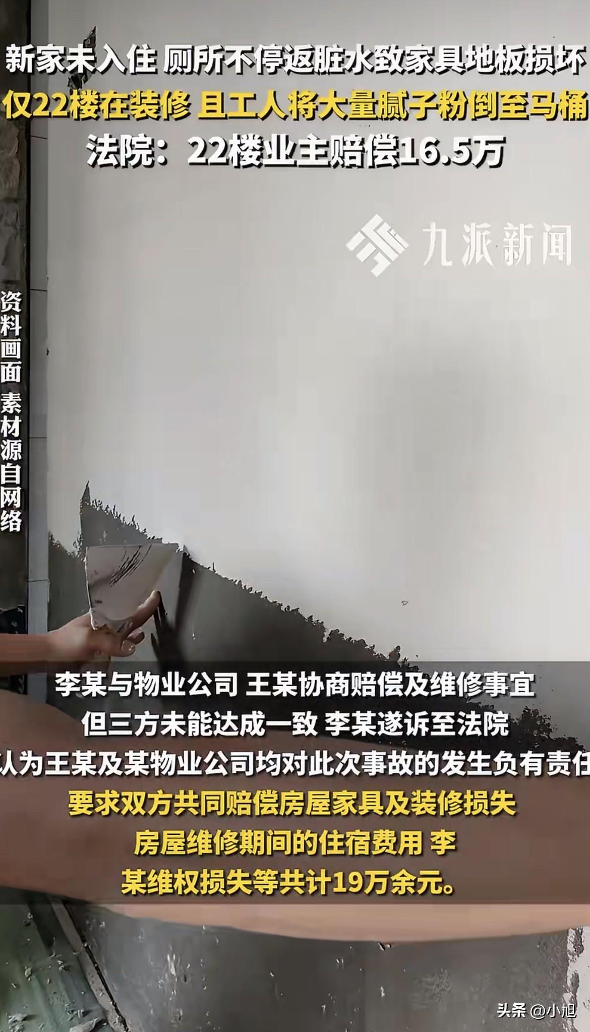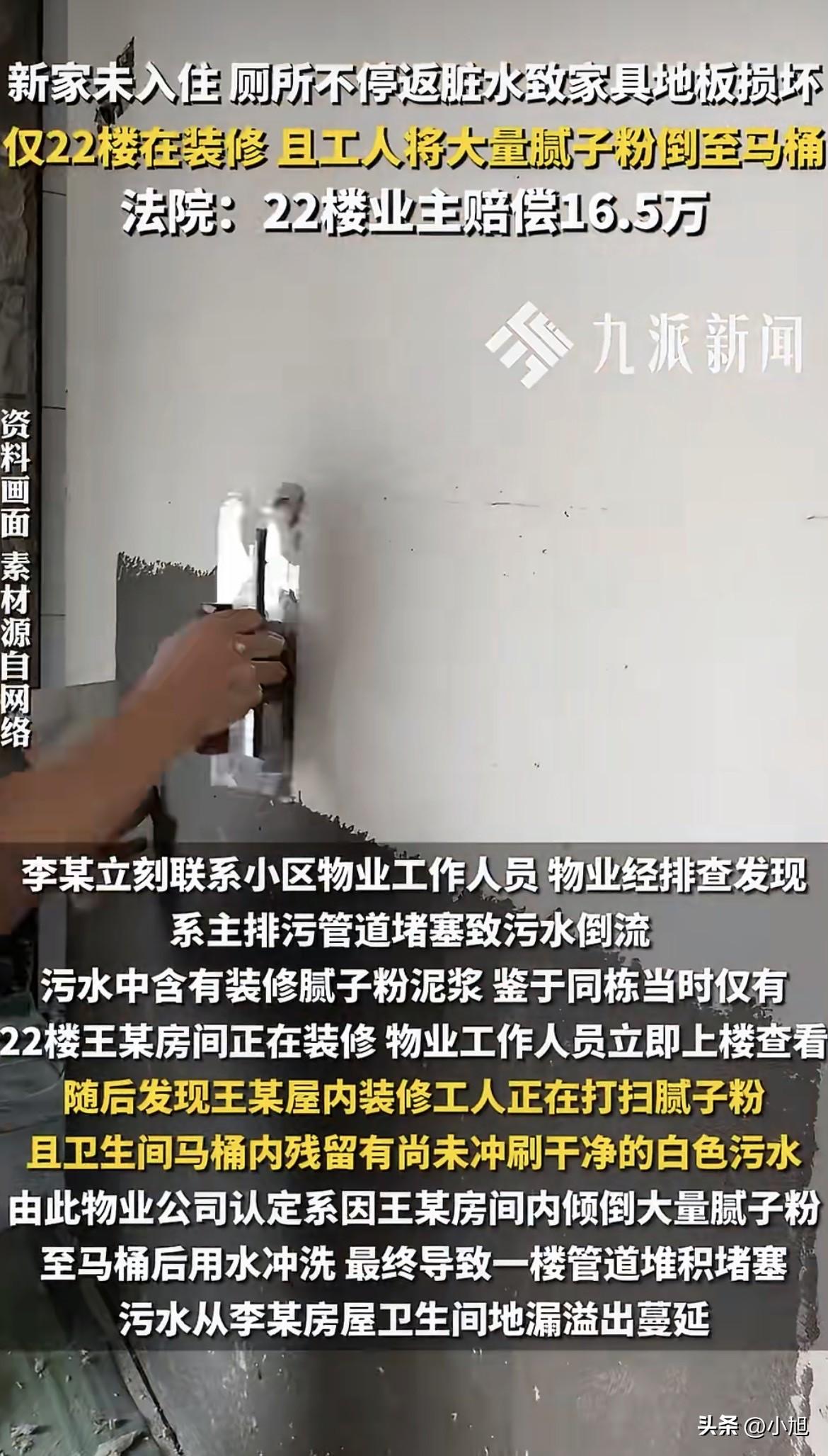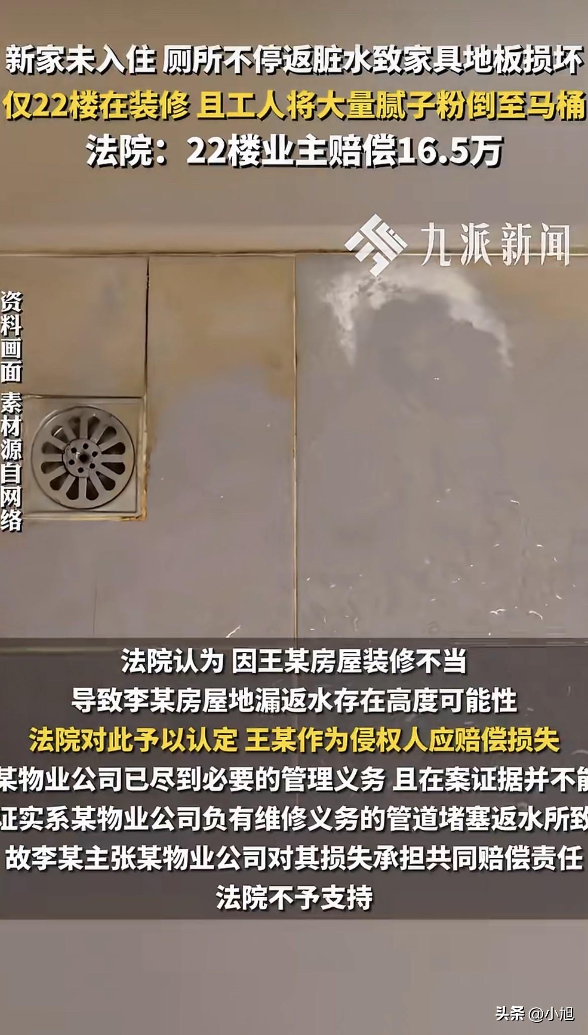 过了些日子,判决下来了。法院认定,是王某家装修工人乱倒腻子粉导致管道堵塞,王某作为业主,得承担侵权责任,赔偿李某16.5万元。而物业已经尽到了必要的管理义务,不用担责。