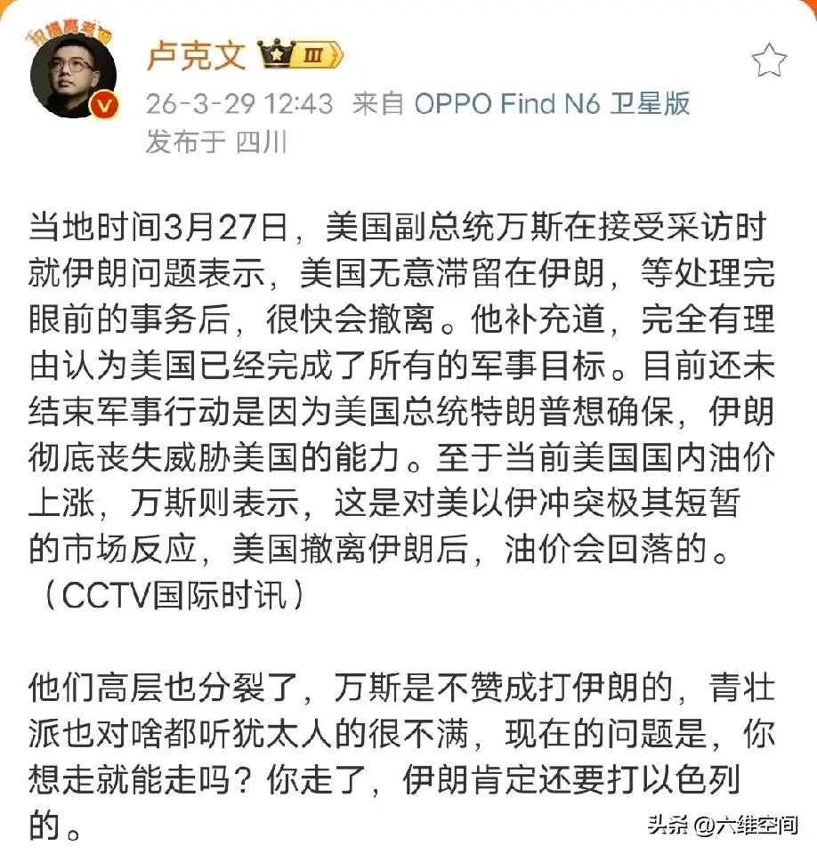 美国副总统万斯最近有点太张扬了,难道不怕被特朗普穿小鞋吗?特朗普本来就因为脱身不了战争,正焦头烂额呢,而万斯却得到共和党保守派阵营过半的支持,而且还跳出来说美国无意滞留伊朗,美军很快撤走,这等于越过特朗普表态,以特朗普的性格,怎么会容忍万斯这样抢风头呢?虽然特朗普现在支持率有点低,但毕竟还是总统,而且下一届总统选举还有2年半时间呢?所以变数非常大,虽然都知道共和党基本就是在卢比奥和万斯之间选一个为代表了,但是这种事情,没有到最后时刻,都没有100%确定的,万斯这样做属于中途开香槟庆祝的操作,很容易翻车的!