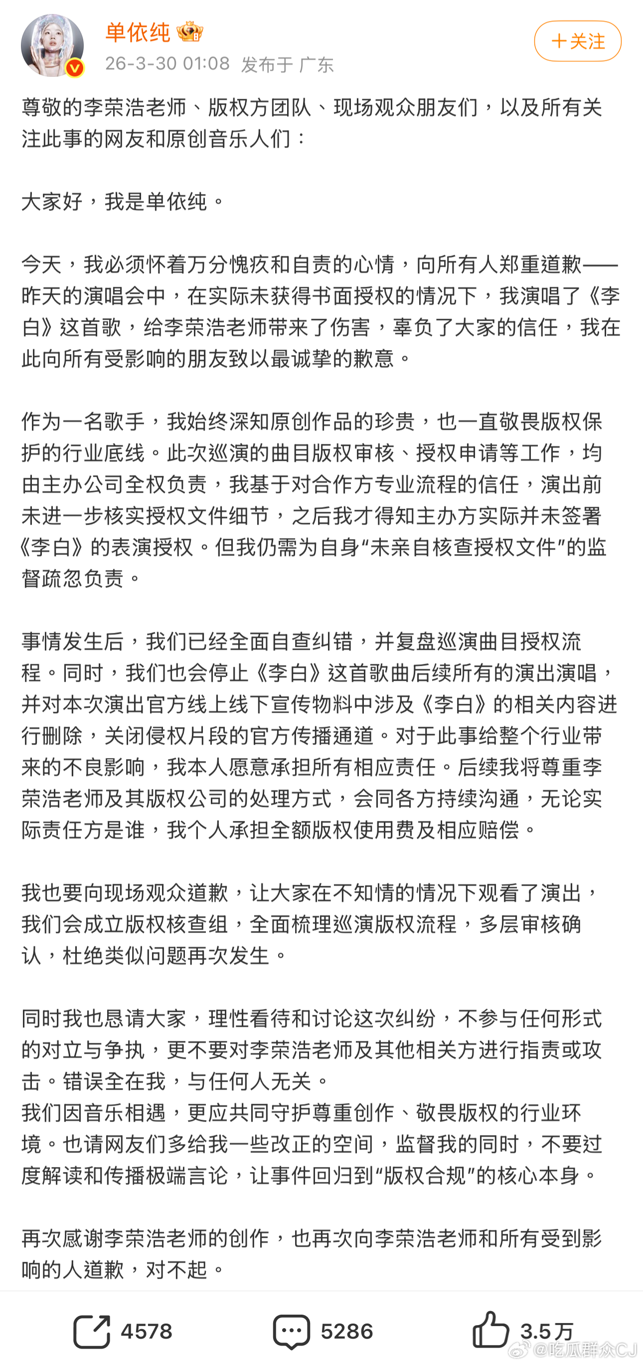 她解释本次演唱会曲目版权审核和授权申请这些工作是由主办方全权负责的,自己出于信任没有再进一步核实,之后才知道《李白》没有得到授权。单依纯说会停止《李白》这首歌后续的演出演唱,相关物料也会做删除和关闭官方传播通道处理,并尊重李荣浩及其版权公司的处理方式。“无论实际责任方是谁,我个人承担全额版权使用费及相应赔偿。”