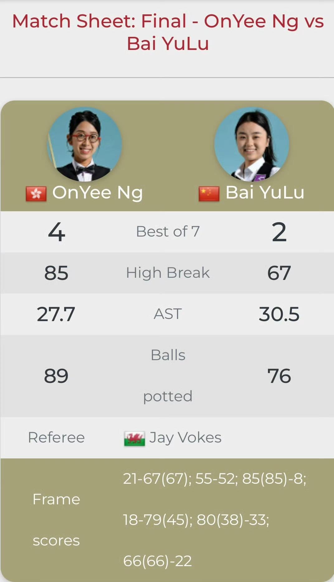 吴安仪4-2击败白雨露!英国女子斯诺克公开赛夺冠! 这是吴安仪第24个冠军。半决