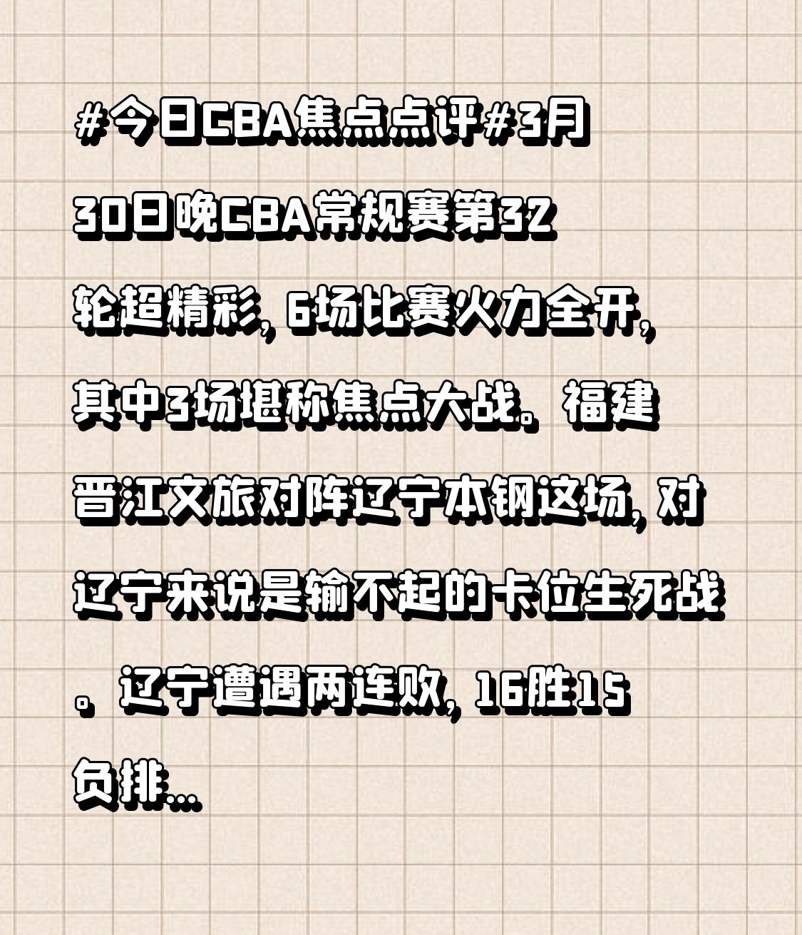 福建晋江文旅对阵辽宁本钢这场,对辽宁来说是输不起的卡位生死战。辽宁遭遇两连败,16胜15负排第11,仅领先广州2个胜场。福建12胜19负排第16,两队排名差距不大,辽宁一旦输球可能跌出季后赛附加赛区。 山东高速迎战天津先行者也备受关注。山东新援贝利·斯蒂尔将主场首秀,此前他火线登场拿下16分10篮板。而天津外援詹姆斯状态火热,连续10场得分上双。两人较量会是本场焦点。CCTV5将直播青岛崂山啤酒与北京控股的比赛,今晚CBA值得期待!