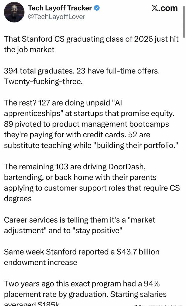 搞AI算法的,这下好了,AI是厉害了,瞧瞧,连斯坦福大学计算机科学专业2026届的毕业生都找不到工作了!这能怪谁? AI要背锅吗?