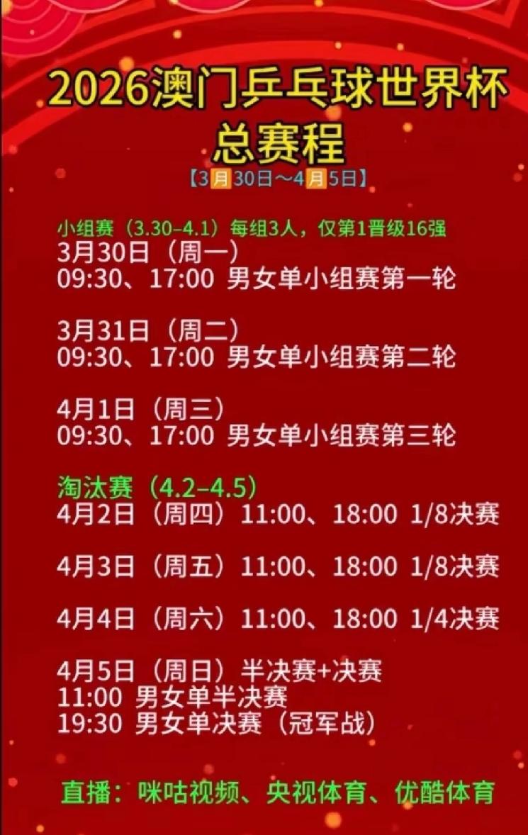 澳门世界杯3月30日国乒赛程 3月30日,澳门乒乓球单打世界杯开打,从3月30到4月1日的三天要进行第一阶段三轮小组循环赛,今天是小组循环赛第一轮。分下午场和晚间场,下午场17:00开始,晚间场20:00开始,特别适合国人生活习惯,工作娱乐两不误。央视体育和咪咕体育有直播。 国乒今天共有3场比赛,孙颖莎,陈幸同和陈垣宇要出赛。由于第一轮要么是小组内第一打第三,要么是第二打第三。只有孙颖莎这一组的三号李昱谆有一定实力,其余安德烈娅和舒迪恩都名不见经传,所以国乒今天三人组取胜毫无疑问。国乒球迷不用担心,可以笑看外协风云变幻。 外协有三场球值得关注:外协的两场攻削大战:单晓娜对桥本帆乃香和申裕斌对琳达·伯格斯特隆;还有就是省队的两场外战:冯翊新PK安东·卡尔伯格,林兆恒PK卡纳克·贾哈。 详细情况参看下图。