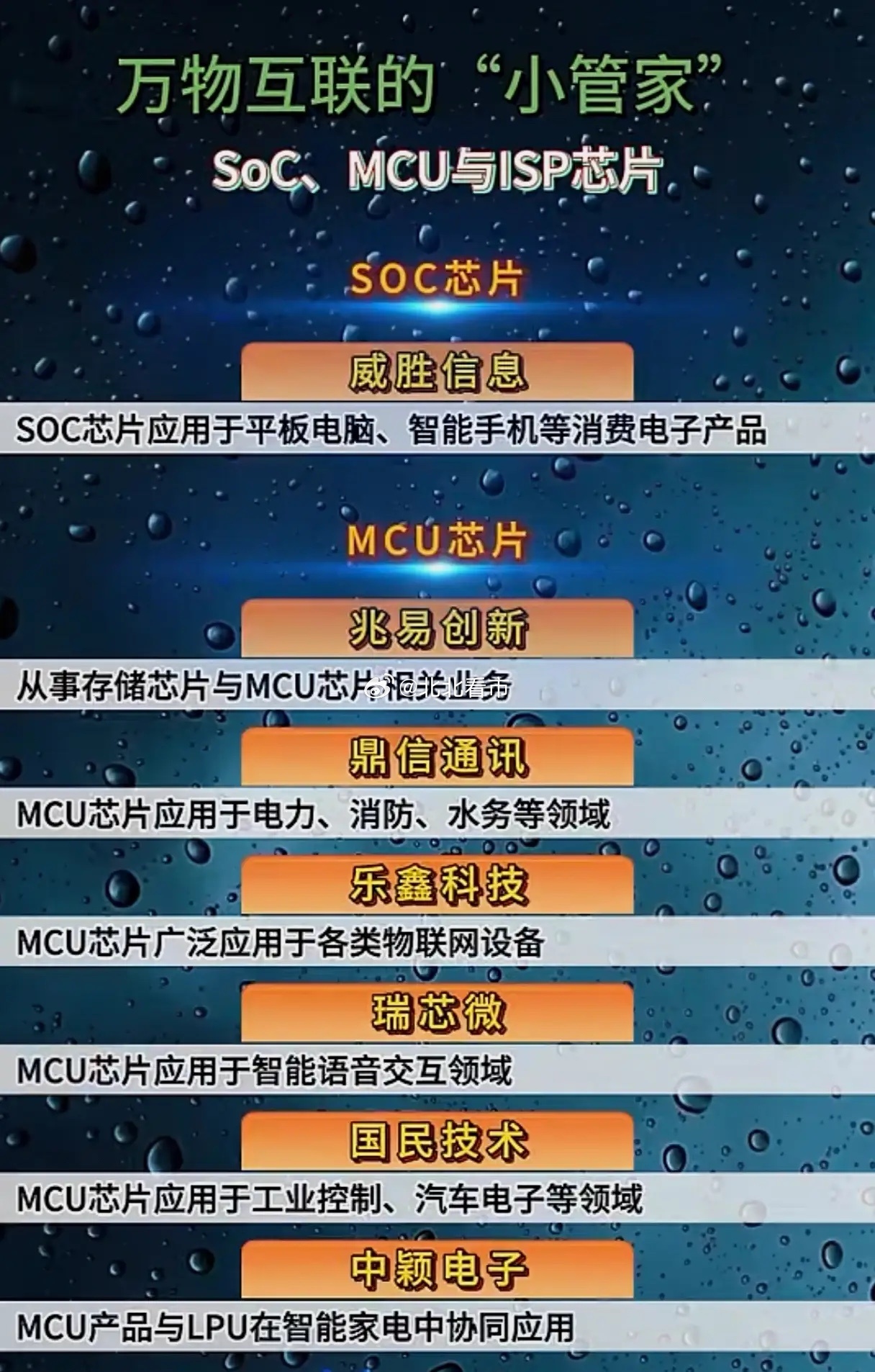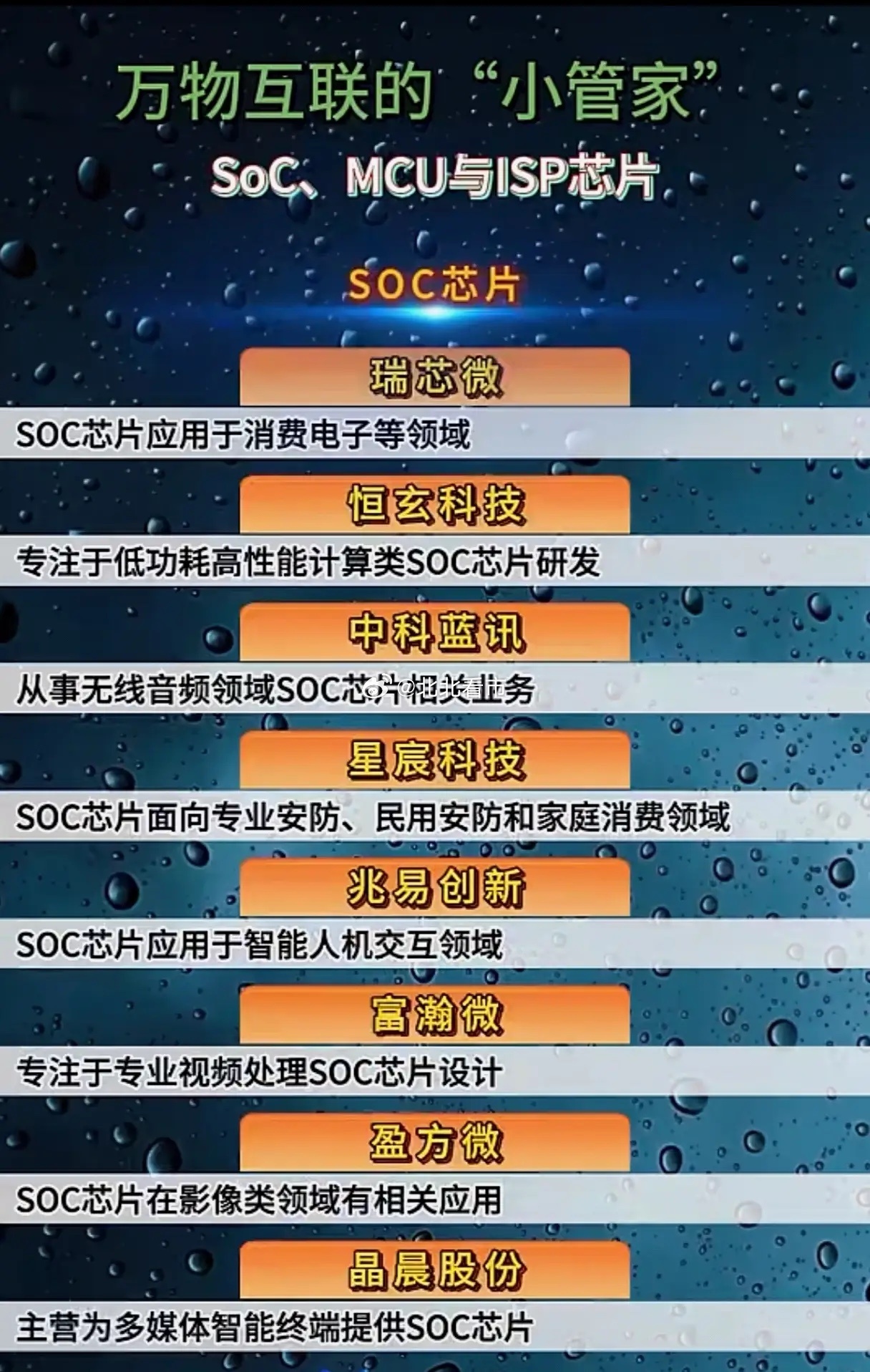 万物互联的“隐形大脑”!SoC/MCU/ISP芯片,谁能扛起国产替代大旗?当AIoT浪潮席卷千行百业,从智能家居到工业互联,从智能汽车到安防监控,所有设备的高效运转,都离不开一颗“隐形大脑”——SoC、MCU与ISP芯片。它们是万物互联的“小管家”,是数据处理的核心枢纽,更是国产芯片突围的关键赛道。2026年,行业迎来两大关键突破,彻底点燃了国产芯片的爆发势能。其一,中科院正式发布“香山”开源RISC-V处理器与“如意”原生操作系统,构建起全链条自主可控的芯片生态,打破了海外架构的长期垄断,为国内SoC、MCU企业提供了核心技术底座,让国产芯片从“能用”迈向“好用”。其二,边缘AI技术深度下沉,MCU芯片全面集成AI推理能力,实现了“算力下沉到终端”,让物联网设备无需云端即可完成实时数据处理,大幅提升响应效率,同时降低了网络依赖,为工业控制、智能家居等场景带来革命性升级。从图片中的核心企业来看,国产芯片力量已全面崛起。SoC赛道,瑞芯微、恒玄科技、星宸科技等企业覆盖消费电子、安防、无线音频等全场景,其中瑞芯微更是推出车规级RK3688M芯片,实现舱驾融合算力突破,打破海外车芯垄断;MCU赛道,国民技术、兆易创新、乐鑫科技等企业深耕工业控制、物联网、汽车电子,在边缘AI加持下,国产MCU正加速替代海外产品,成为工业互联的核心支撑;ISP赛道,星宸科技、北京君正、国科微等企业掌握AIISP、双3D降噪等核心技术,为AI视觉、机器人等领域提供高性能影像处理方案,填补了国内高端影像芯片的空白。当前,国产芯片正迎来政策与技术的双重红利,国家发改委明确加码物联网核心芯片攻关,深圳等多地出台专项政策支持国产芯片迭代。随着万物互联时代的全面到来,SoC、MCU、ISP芯片的市场需求将持续爆发,国产替代空间广阔。但需注意,部分个股短期涨幅过大,存在估值回调风险,投资者需重点关注技术壁垒高、业绩确定性强的龙头企业,把握国产芯片的黄金成长机遇。