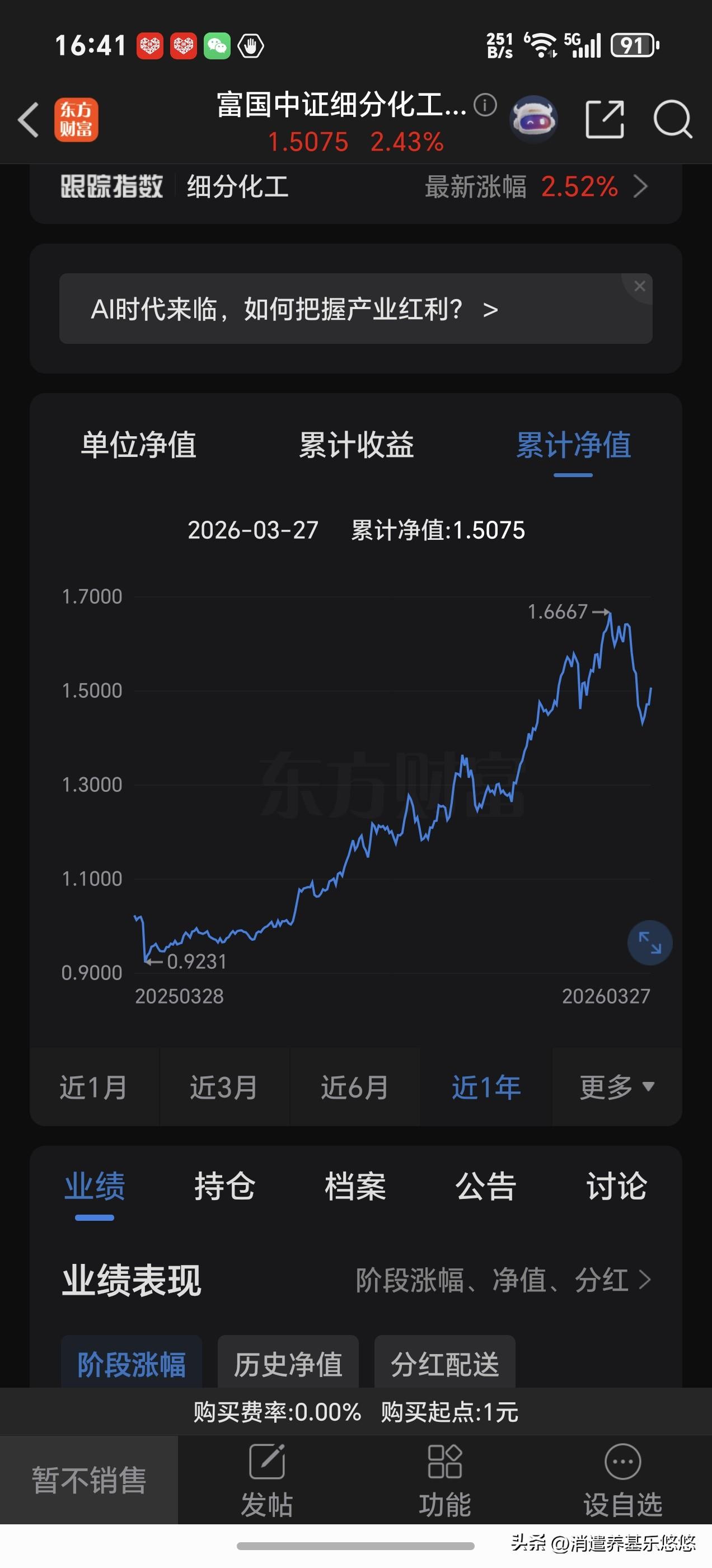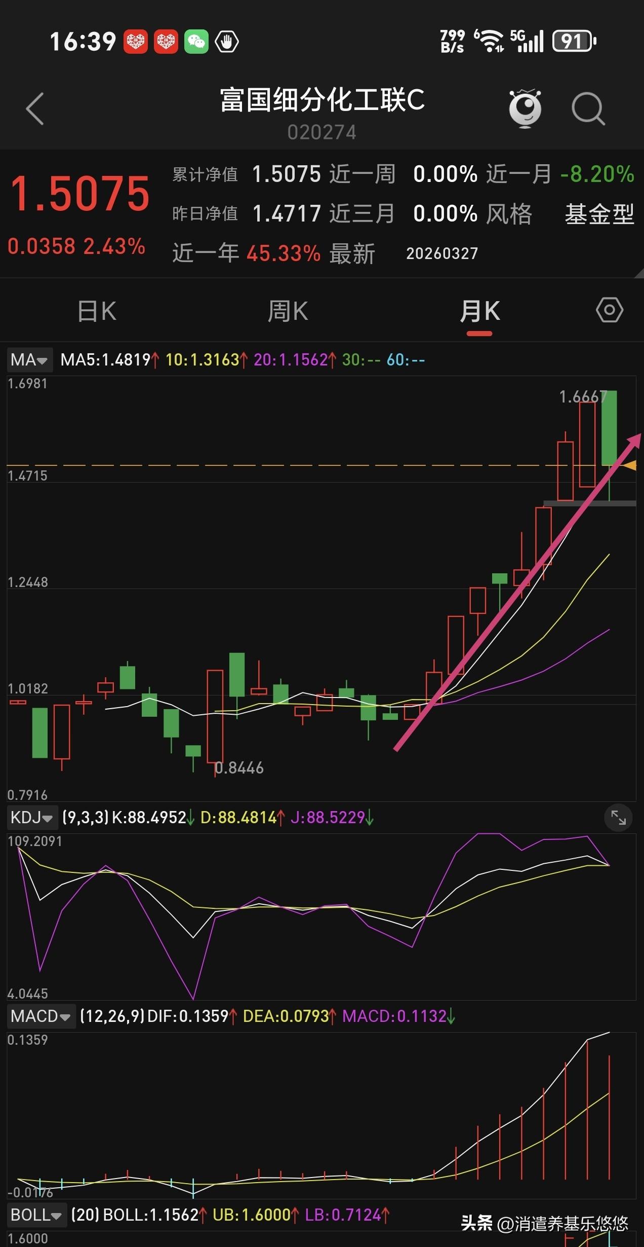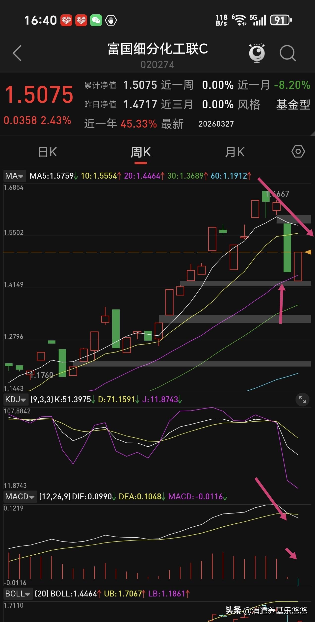 富国细分化工是跟踪细分化工指数基金,近6个月涨幅26%,近一周涨幅3.6%。下面是它的日线周线月线年线走势图: 年线持续性上行大涨一年,涨幅业绩不错。月线目前还是上升趋势中,5月线获得了支撑。 周线走势跌破了5-10周线支撑,主要是近期下跌所致,5周线开始拐头向下↓,但是距离死叉10周线还有空间。 日线走势上周连续三天反弹已经突破了5-10是线压力,5日线拐头向上运行,kdj金叉,macd绿柱缩短,所以日线有企稳反弹欲望。日线自高点下来已经回调了近15%,短期回调幅度不算少了。目前介入风险相对来说比较低,前面高位介入深度套牢的人,可以补仓降低成本。
