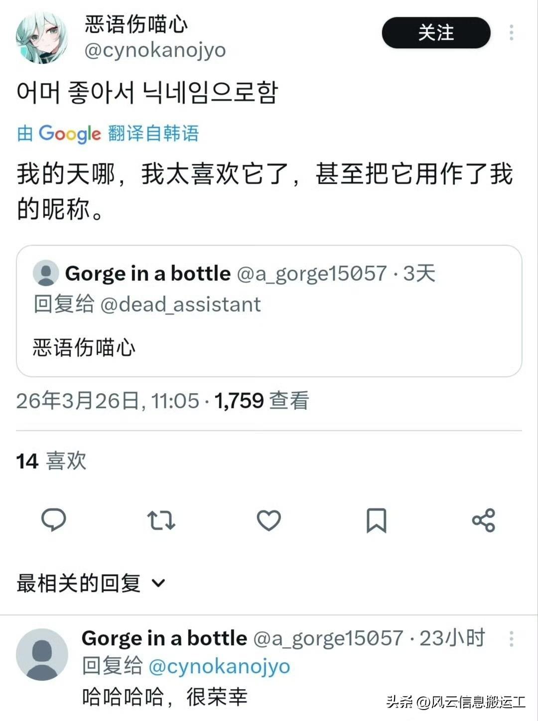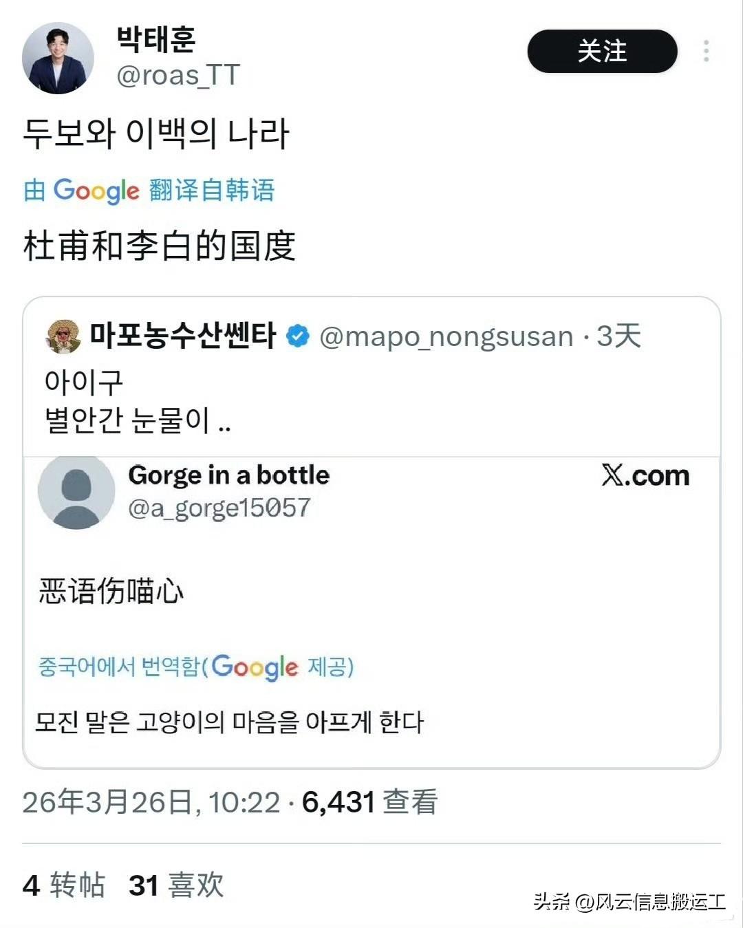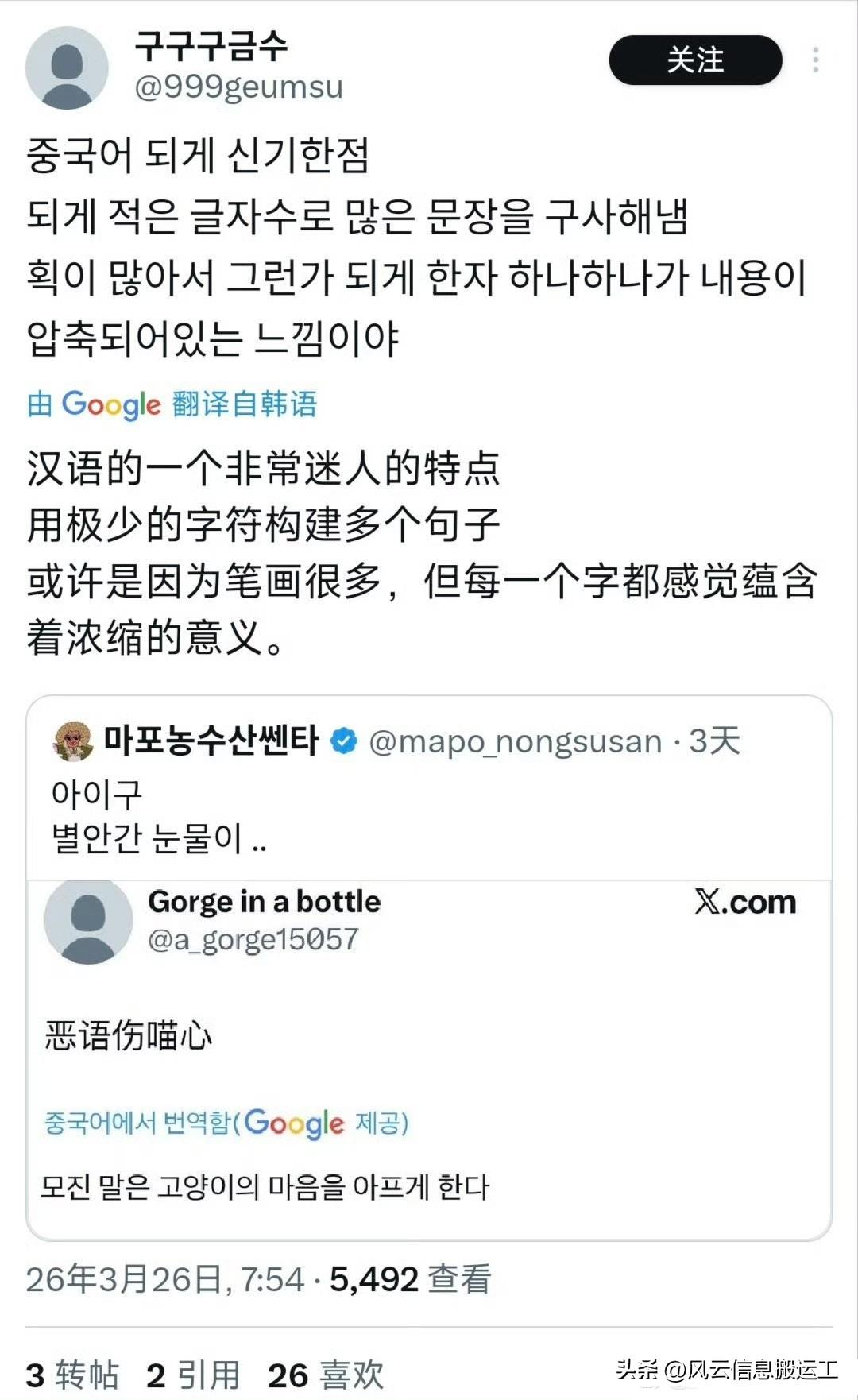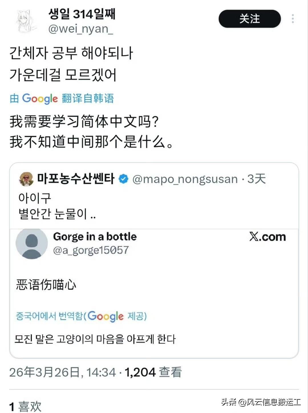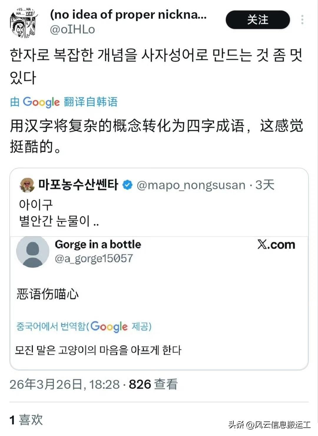 推特上一位韩国网友分享自己的猫咪,中国网友评论猫咪壮的像牛一样引发韩国网友大笑,另一位中国网友对此评价到恶语伤喵心又引发韩国网友对中文的赞赏(中文博大精深)
