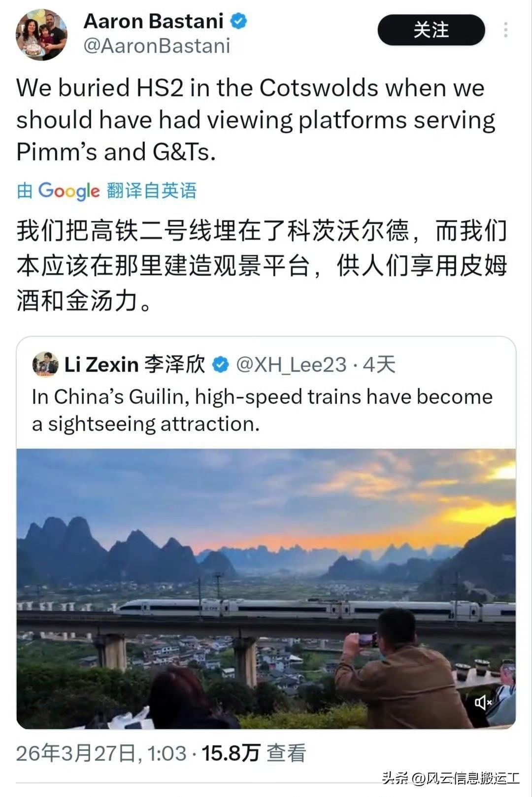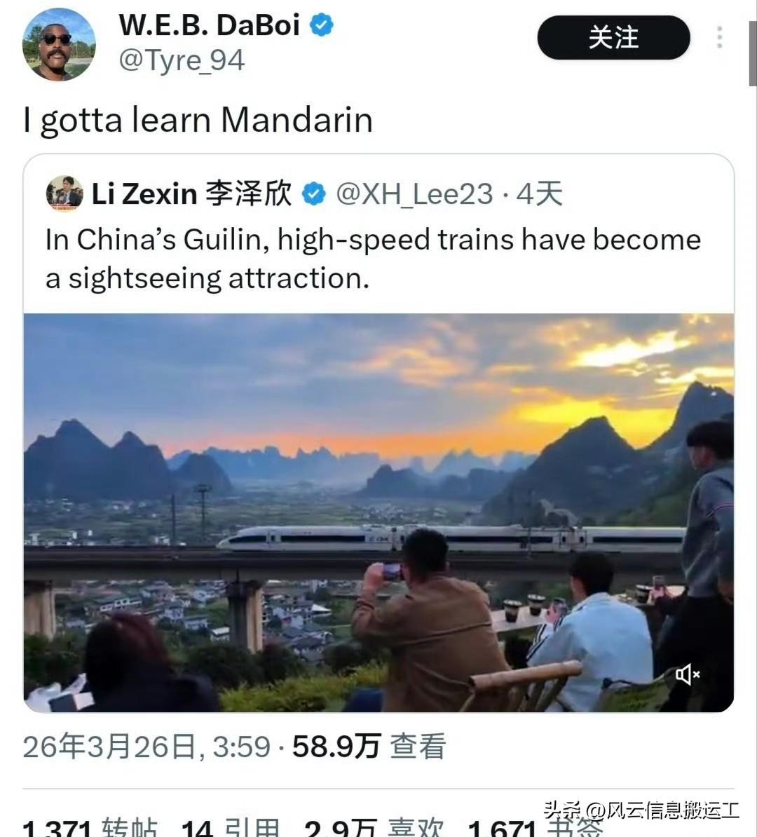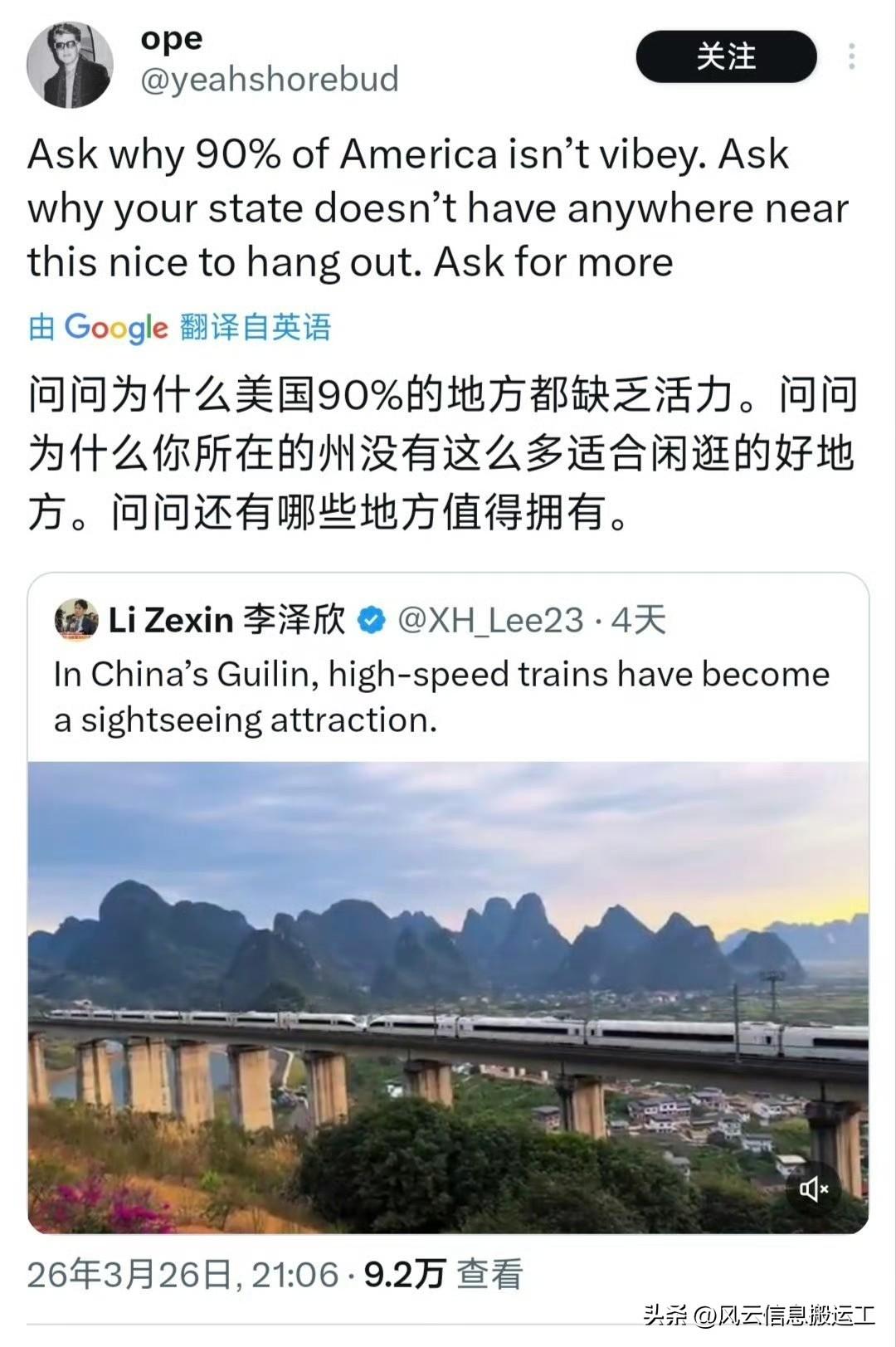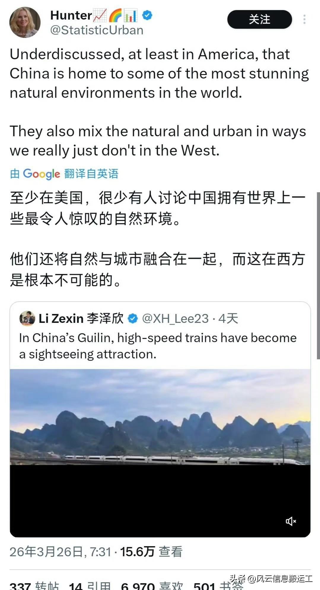 推特上中国桂林高铁与美景相融合的视频引起网友热议!