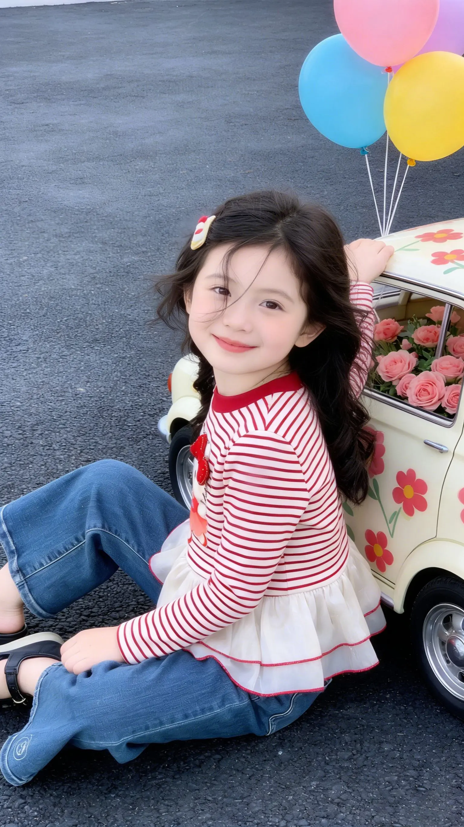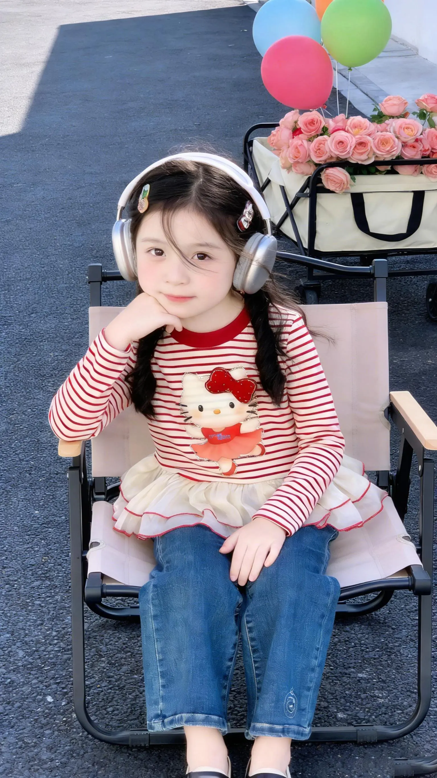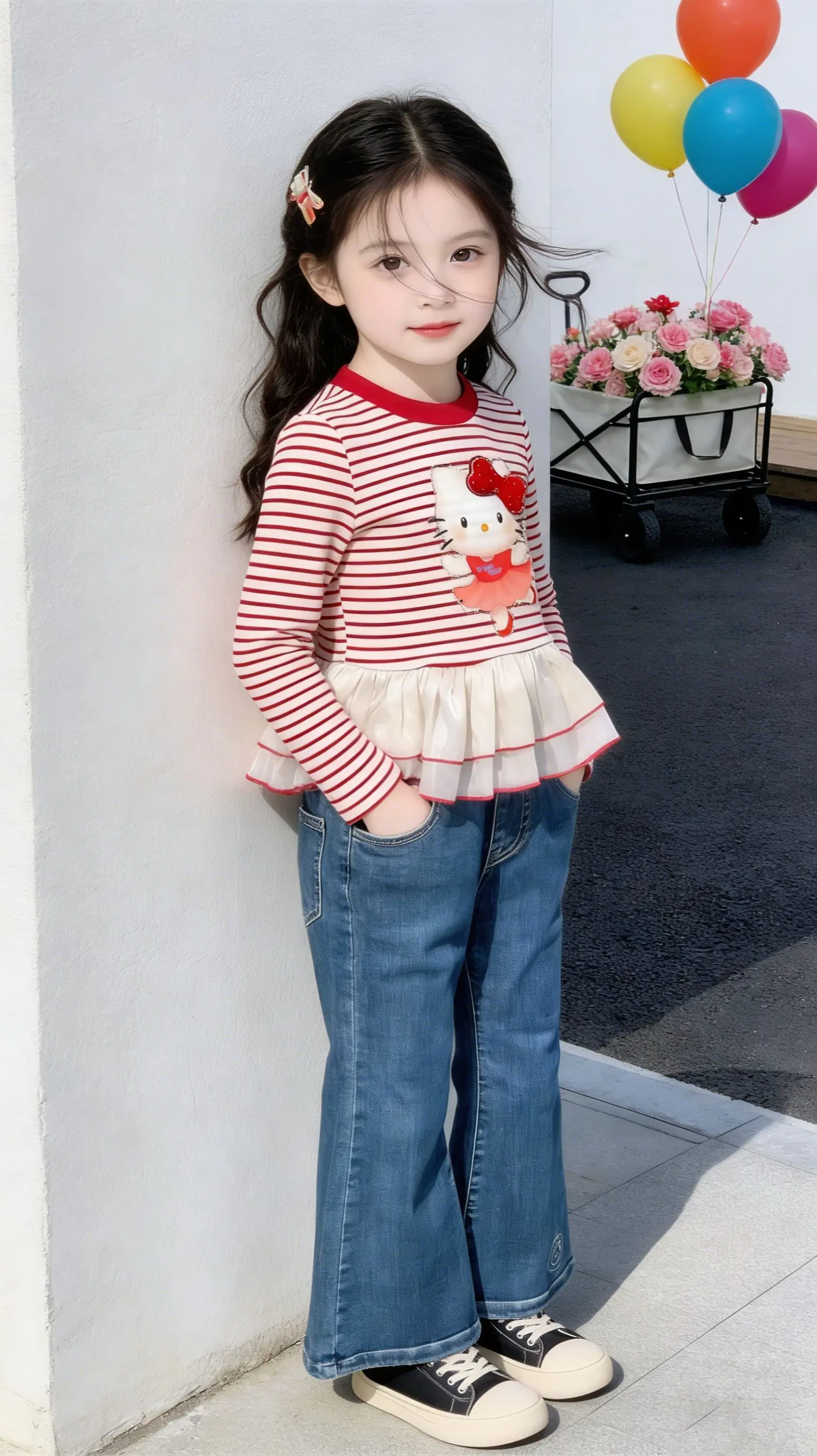 软萌天花板。- 韩系女童穿搭公式get!经典条纹+复古喇叭裤,显瘦又显高,Hello Kitty贴布绣萌到心化,阳光底下拍照太出片啦~