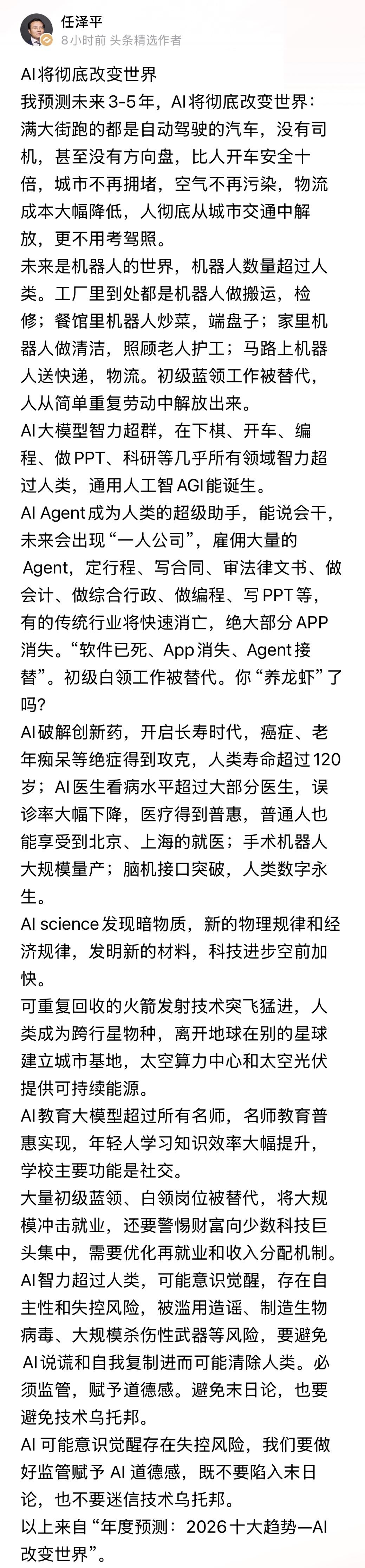 著名经济学家任泽平博士的超级大预测!! AI将彻底改变世界,就是这三五年的事情。 未来是自动驾驶和机器人的世界了; 大部分工作都是由人工智能和机器人完成; 任博士认为,这样人类更加安全了,环境也更好; 人类可以从简单繁重的工作中抽身,彻底解放了双手。 任博士还预测,不但这些工作得以解决; AI还可以破解药物的创新,人类的寿命可以超过120岁。 教育,科技,生命,将跃升到一个极高的高度。 之后,AI可能还有自己意识,这个也是巨大的风险,可能会导致失控。 任博士不忘做出警示:我们要相信技术,也不要迷信技术。 对于任博士的关于2016年的十大预测,全部是AI的内容; AI时代彻底来了,今天如果不AI,明天你就被AI取代!! 任博士不愧是恒大前首席,年薪1500万中国最贵的经济学家; 这个预测,太狠了!! 看完之后,能实现财富自由,人生巅峰么? 对此,你有何看法呢?