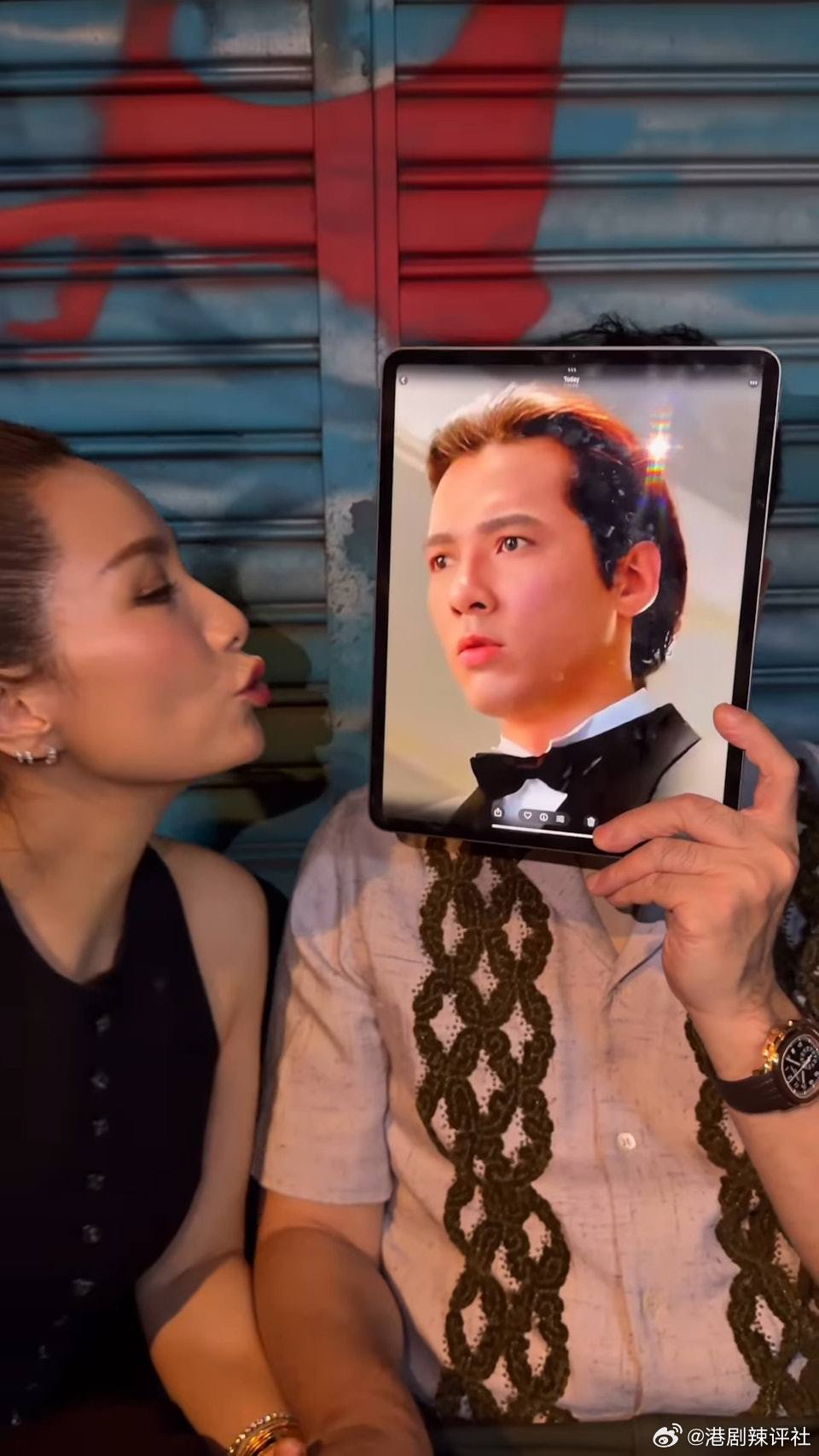 正當大家以為單立文會帥氣十足地出現鏡頭前時,畫面卻令人意想不到!單立文用平板電腦擋住頭部,屏幕中顯示的是他昔日經典角色「侯賽因」的靚仔造型劇照。胡蓓蔚對著「侯賽因」做出嘟嘴作勢親吻的動作,最後自己也忍不住爆笑出聲,畫面搞笑。主動拖住老公。